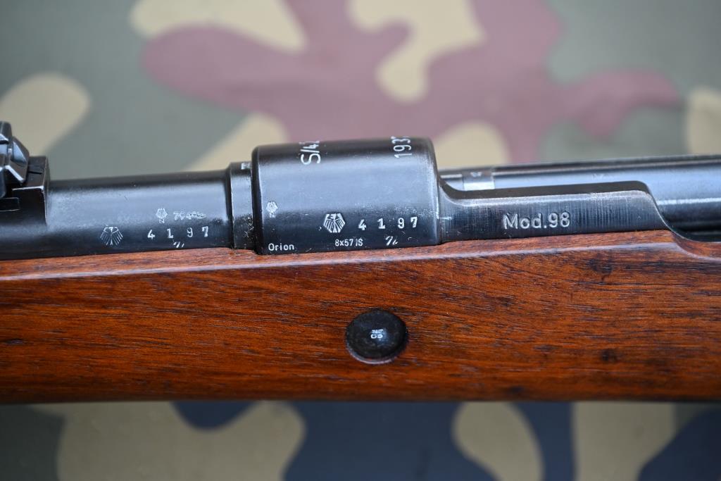 Herstellerlogo „S/42“ und Jahreszahl „1937“ oben auf der Hülse, linksseitig „Mod. 98“, viele „WaA“-Stempel auf Lauf, allen Schlossteilen, Visier, Hülse und Beschlägen (WaA63). WaA-Abnahmen auch auf beiden kleinen Sicherungsschraubenköpfen.