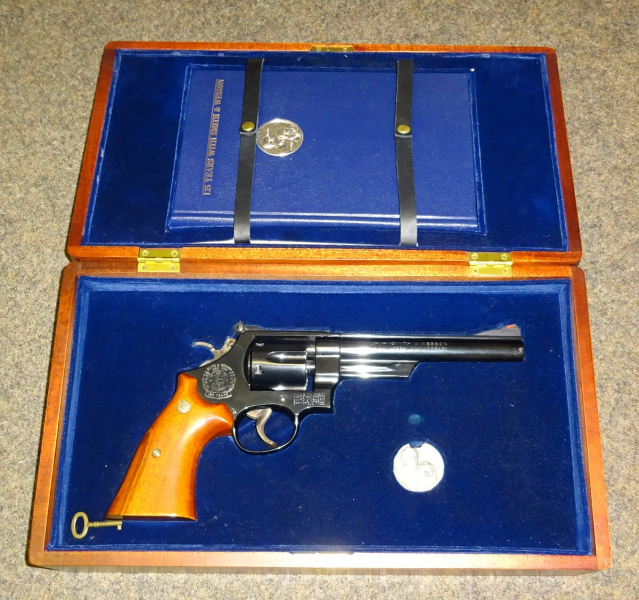 Commemorative model "SMITH&WESSON - 125th anniversary" model 25-3 in cal. .45LC; 6.5 inch barrel, in neat condition (one minor dent at the right side of the muzzle, as shown in the photo." Comes in noble wooden box, with silver medal and a book with comprehensive presentation of company history and its gun models up to year 1977.