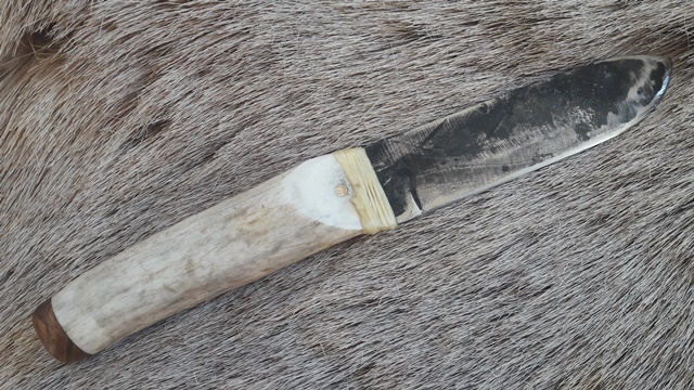 Handgeschmiedete Messer "Rifleman Patch-knife" mit Hirschgeweih Griffschalen, klinge 115 mm lang, Gesamtlange 225 mm, Scheide aus Hirschleder, mit kliene Schmiedespurren / Handforged Rifleman, patchknife, blade 115 mm long, total lenght 225 mm, handle from deer antler .