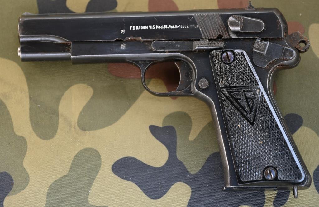 Auf dem Schlitten sehr gut lesbar „F.B.RADOM VIS Mod. 35. Pat.Nr. 15567.", diverse WaA-Stempel (Adler über 77)Seriennummer. Bundesrepublikanische Beschusszeichen von 1969 links auf dem Rahmen und auf dem Schlitten.