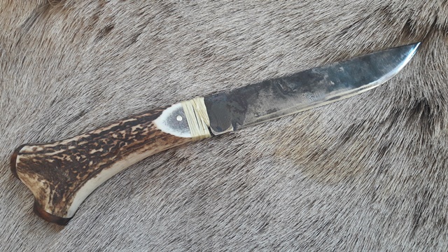Handgeschmiedete Messer "Englisches Trade-Scalping-Messer-stil", mit Hirschgeweih Griffschalen, klinge 182 mm lang, Gesamtlange 320 mm, Scheide aus Hirschleder, mit kliene Schmiedespurren / Handforged scalping knife, in Hudson Bay Fur&Trade company-style, blade 182 mm long, total lenght 320 mm, handle from walnut wood.