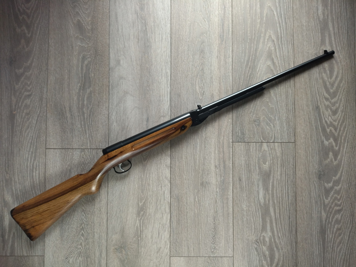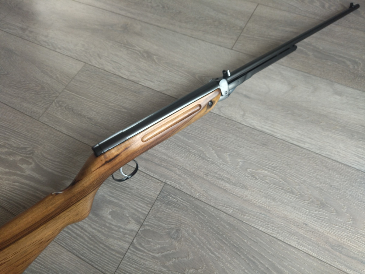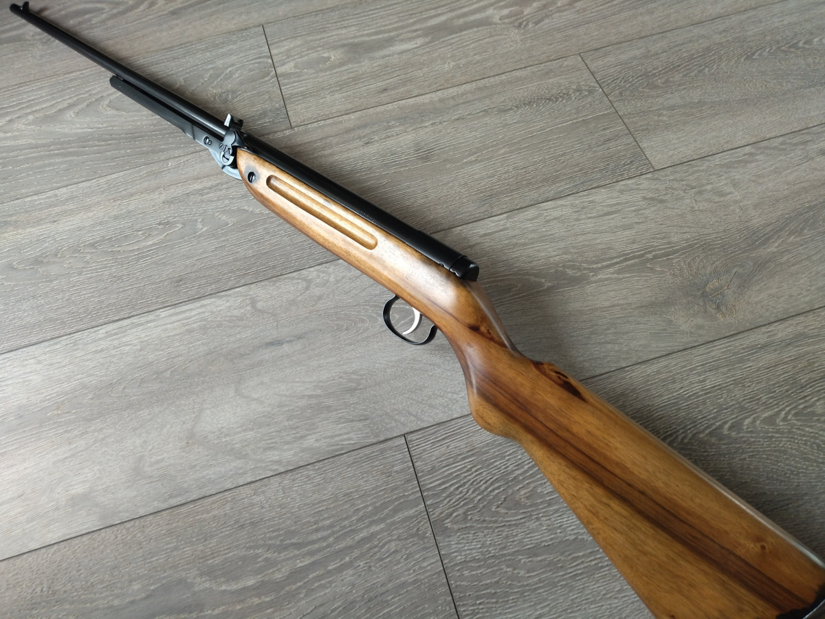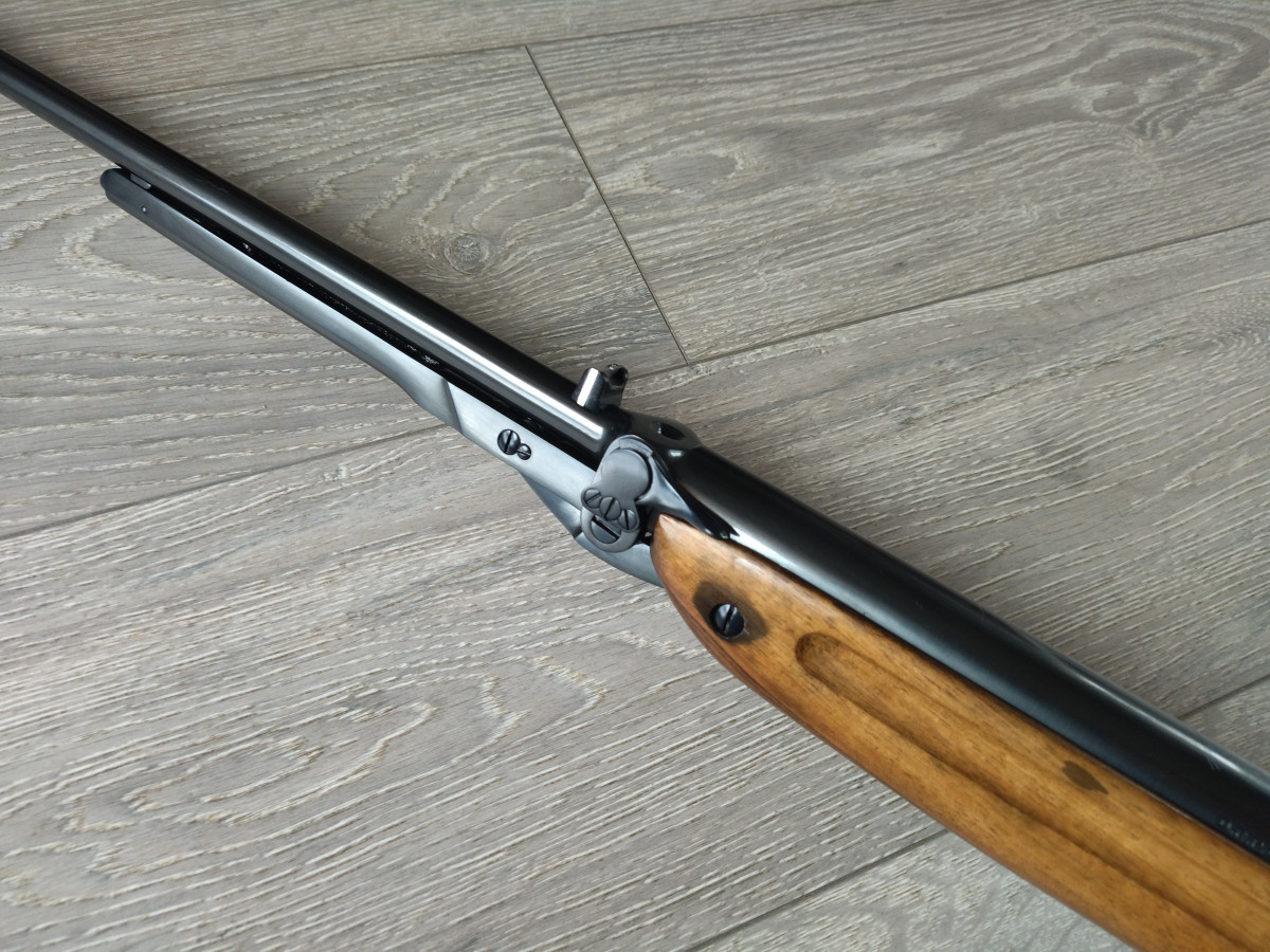 Einzellader unterhebelspanner Luftgewehr, mit starrem Lauf, Kaliber 4.5 mm, Lauf gezogen, Länge 1080 mm, Gewicht ca. 3,5 Kg. Einstellbarer Abzug. Nussbaumholz Schaft.