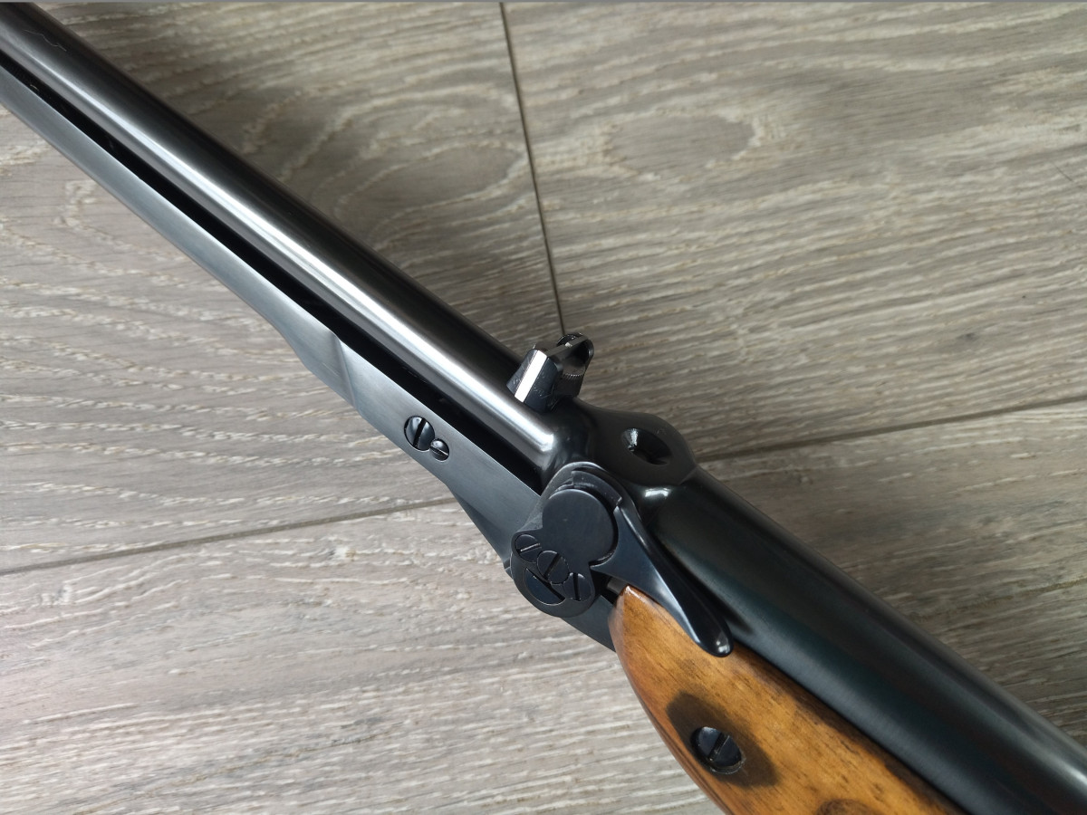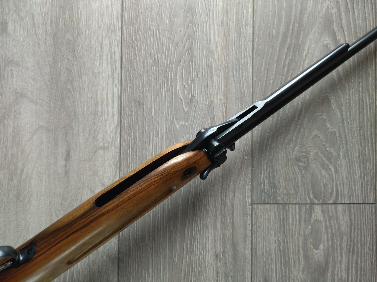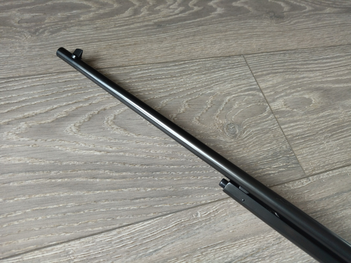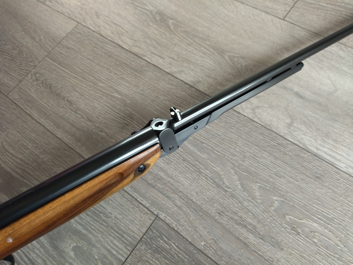 Einzellader unterhebelspanner Luftgewehr, mit starrem Lauf, Kaliber 4.5 mm, Lauf gezogen, Länge 1080 mm, Gewicht ca. 3,5 Kg. Einstellbarer Abzug. Nussbaumholz Schaft.
