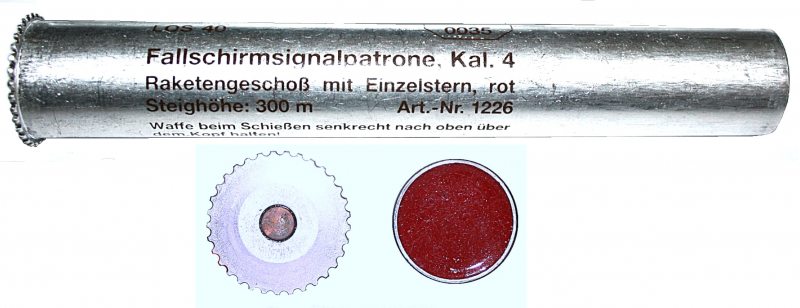 Sie bieten auf eine Fallschirmleuchtpatrone mit rotem Stern. Die Patrone ist ein Sammlerstück und nicht zum Verschuß geeignet ( überlagert ). Weiteres siehe Fotos, sie zeigen den Gegenstand dieser Auktion. Eigenverkauf aus Sammlungsauflösung