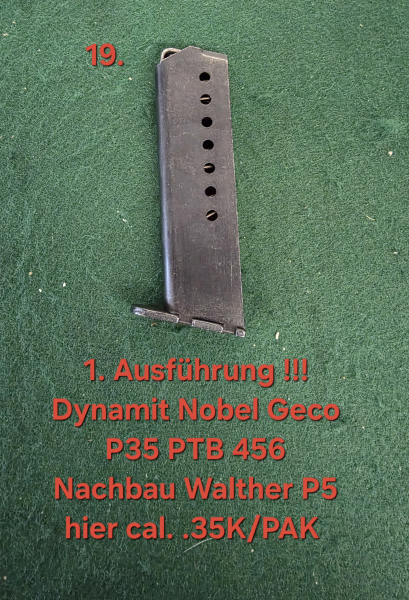 19.) 1. Gen. ! Dynamit Nobel Geco Mod. P35 PTB 456 Magazin Schreckschuss Cal. .35 PAK P35 Walther P5
