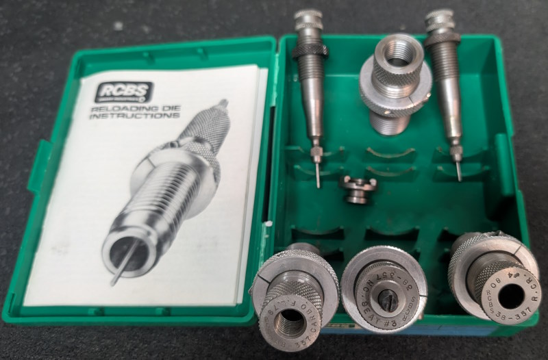 Verkaufe im Auftrag einen Matrizensatz von RCBS mit der Nummer #55000. Kaliber .38 Special und .357 Magnum. Bestehend aus einer Vollkalibriermatrize mit Hartmetalleinsatz, Aufweitmatrize mit Zündhütchenausstoßer (eins für .38 und eins für .357), einer Setzmatrize und einer Rollcrimp Matrzie. Verkauf in Original RCBS Box. Die Matrizen scheinen weing genutzt worden zu sein.