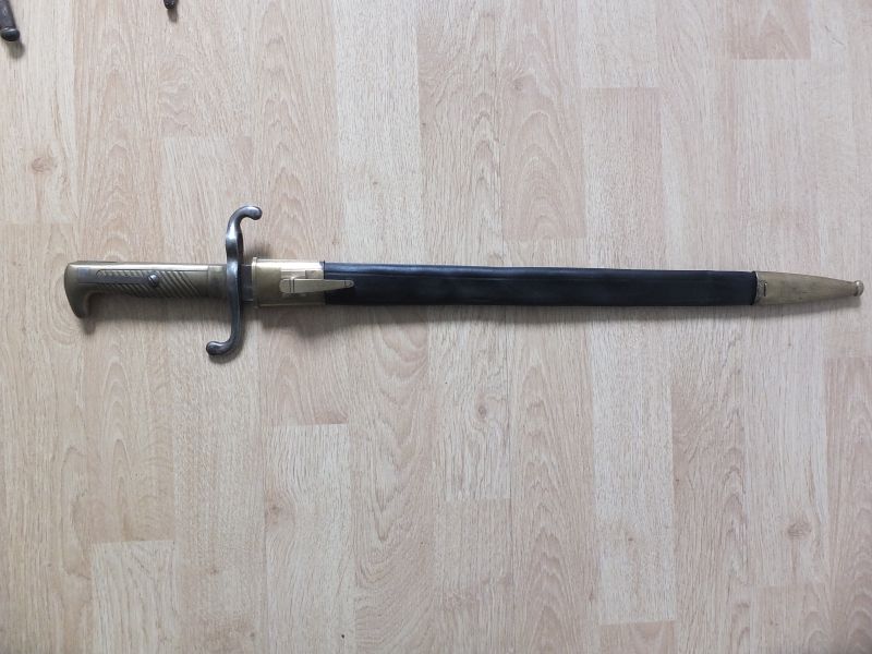Baïonnette S71 Fabricant Gebr. SIMSON W76. Marquage 67. R.8.180 (Infanterie-Regiment 67, Kompanie 8 Arme 180) en excellent état. Le fourreau présente les poinçons de contrôle sur les garnitures laitons mais pas de marquage régimentaires. Le cuir a perdu sa souplesse et la baïonnette ne rentre pas totalement dans le fourreau. D'autres photos sur demande.