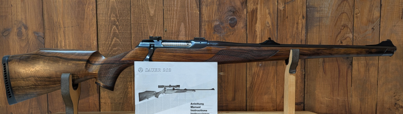 Selten geführter Stutzen Sauer 202 Luxus im Kaliber .308Win. Stahlgehäuse .Der Schaft mit bayrischer Backe, ist tief dunkel gemasert . Die Kammer ist mit einem Sonnenschliff versehen. Beim Abzug handelt es sich um einen trocken stehenden Flintenabzug. Basen einer Schwenkmontage sind montiert. Stahlmagazin. An der Waffe befinden sich minimale Gebrauchsspuren am Schaft , ansonsten ist die Waffe in einem tadellosem Zustand, keine erkennbare Schussbelastung. Lauflänge 51cm, Gesamtlänge ca.103 cm. Weitere Bilder übersende ich gern auf Anfrage.