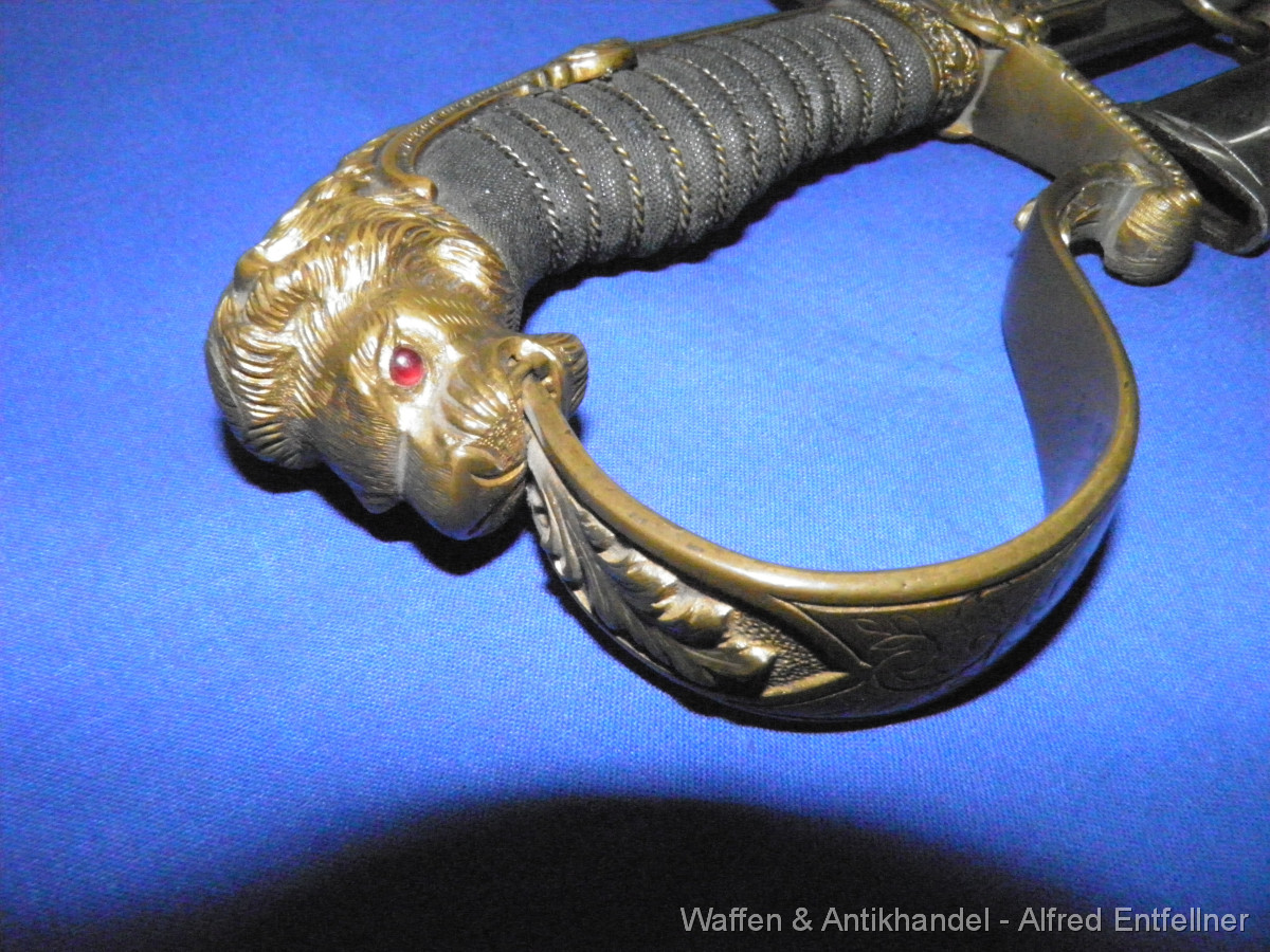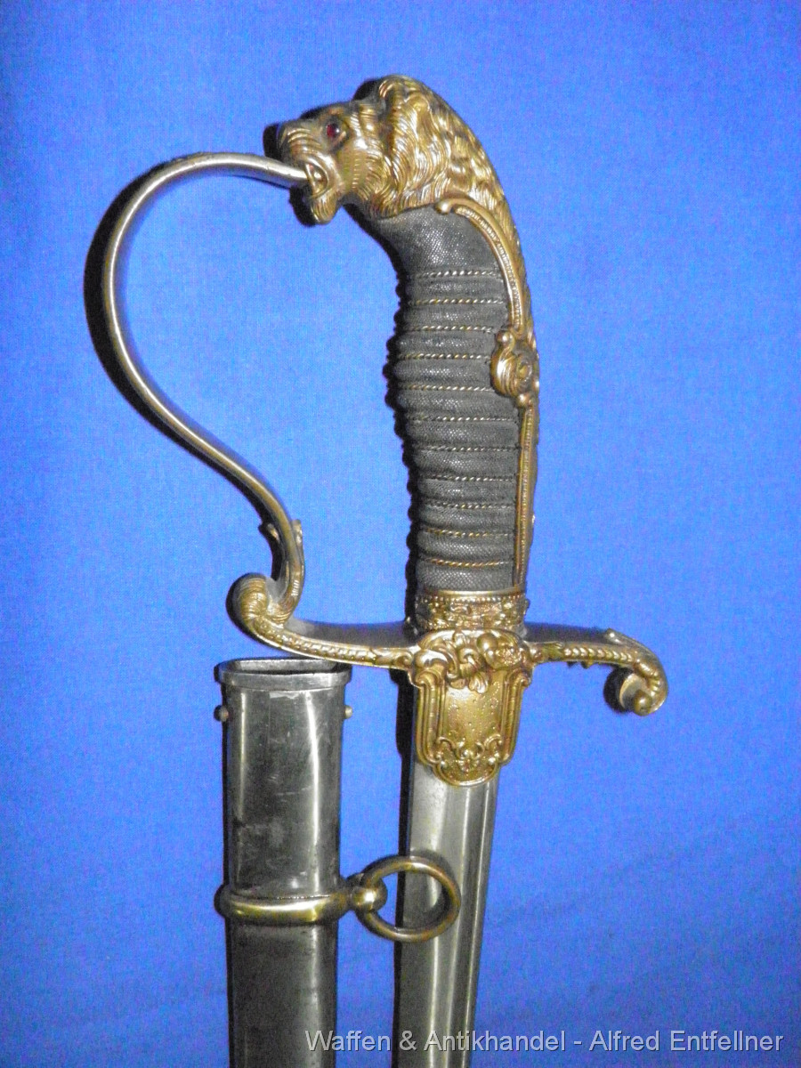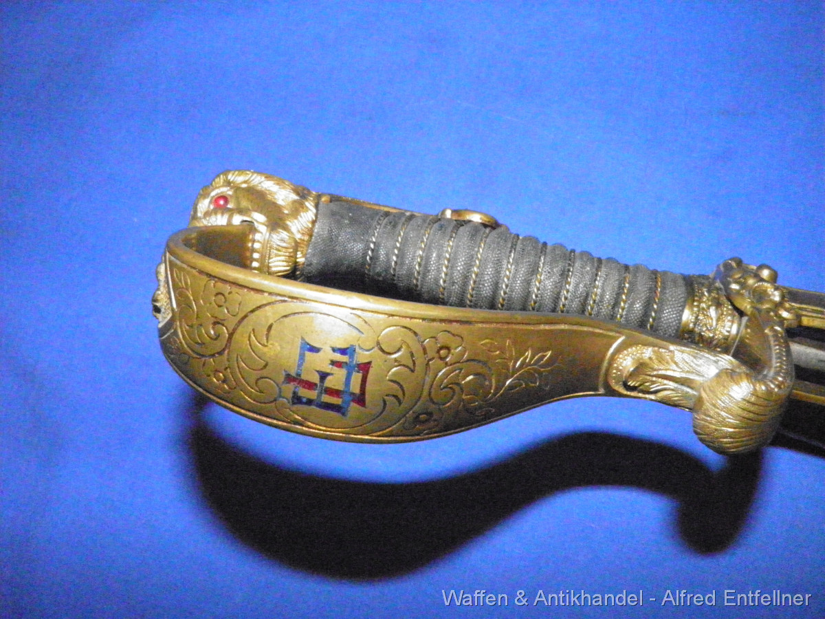 Sehr schön Barock verziertes Gefäß, schöner Löwenkopf Rubinaugen. Besonderheit Trägermonogramm in Emaille ausgeführt. Scheide vernickelt gut erhalten, ohne Dellen.