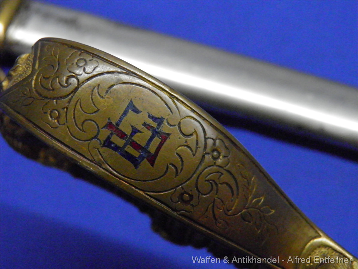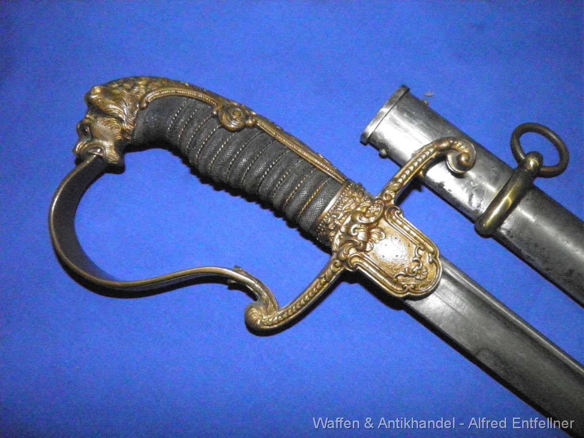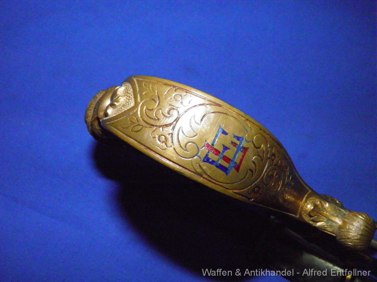 Sehr schön Barock verziertes Gefäß, schöner Löwenkopf Rubinaugen. Besonderheit Trägermonogramm in Emaille ausgeführt. Scheide vernickelt gut erhalten, ohne Dellen.