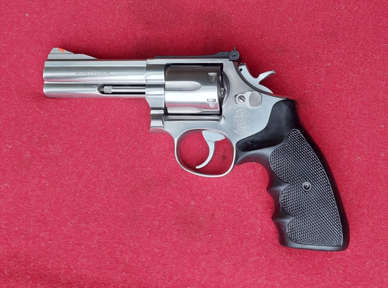 Revolver "Smith & Wesson", Modell: 686-3 / Kal.: .357Mag / Stainless-Steel-Fertigung / Lauflänge 4" / die Züge im Lauf sind blank und scharf / sehr guter Gesamtzustand mit wenig oberflächigen Spuren / mit verstellbarer Visierung / Gummigriffe