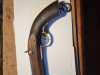 Pistole nach engl. Muster. Damastlauf gezogen, Inschrift verschliffen kaum zu erkennen, Pulver Resovar, Schloss geht in zwei Rasten, Länge 39cm, Cal.14 mm (13,9)mm).Schuss fähig Ohne Abnahmen-Schaft Nussbaum