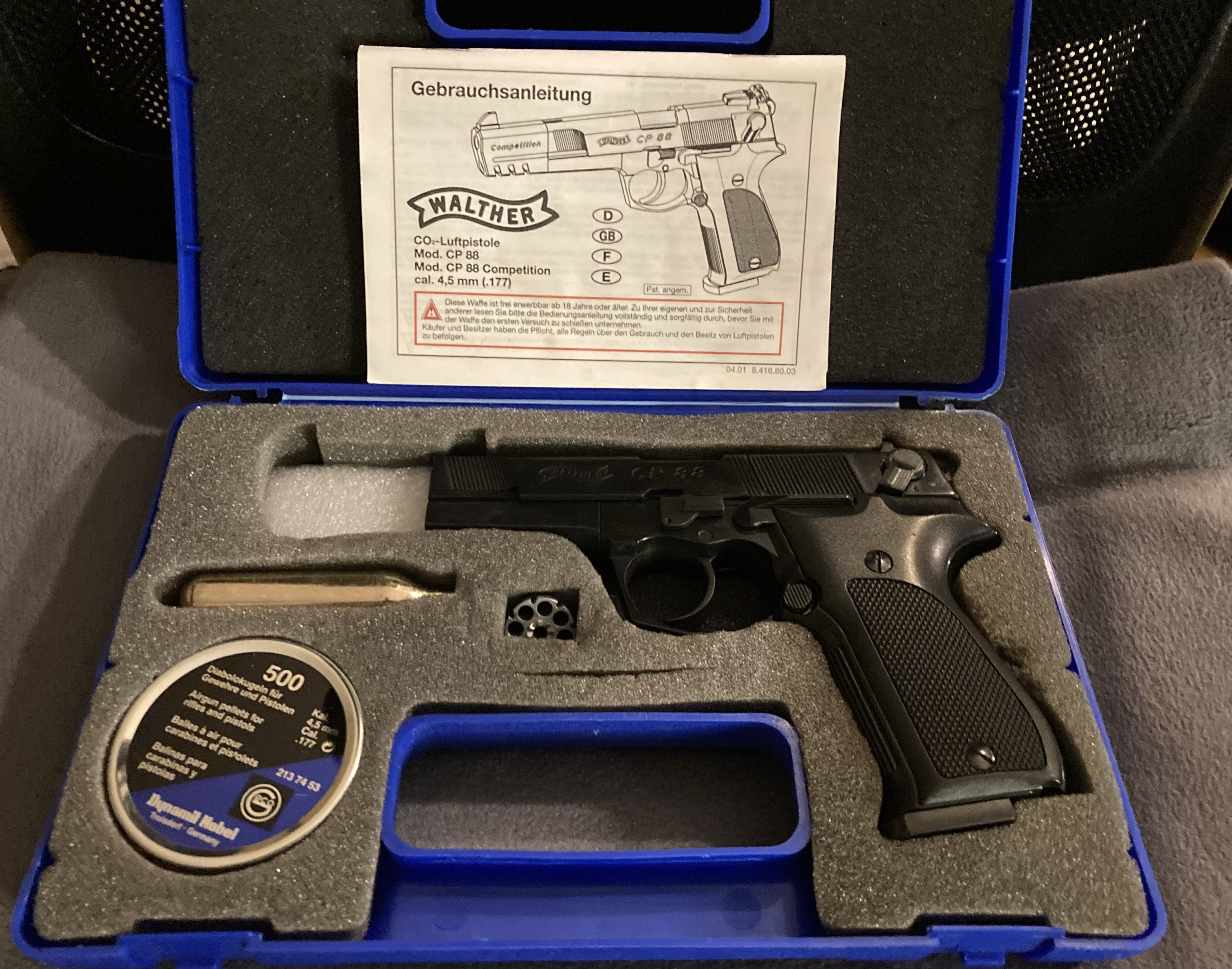 Umarex Walther CP 88 Luftdruck CO2 Pistole, wie abgebildet mit Zubehör im Waffenkoffer.