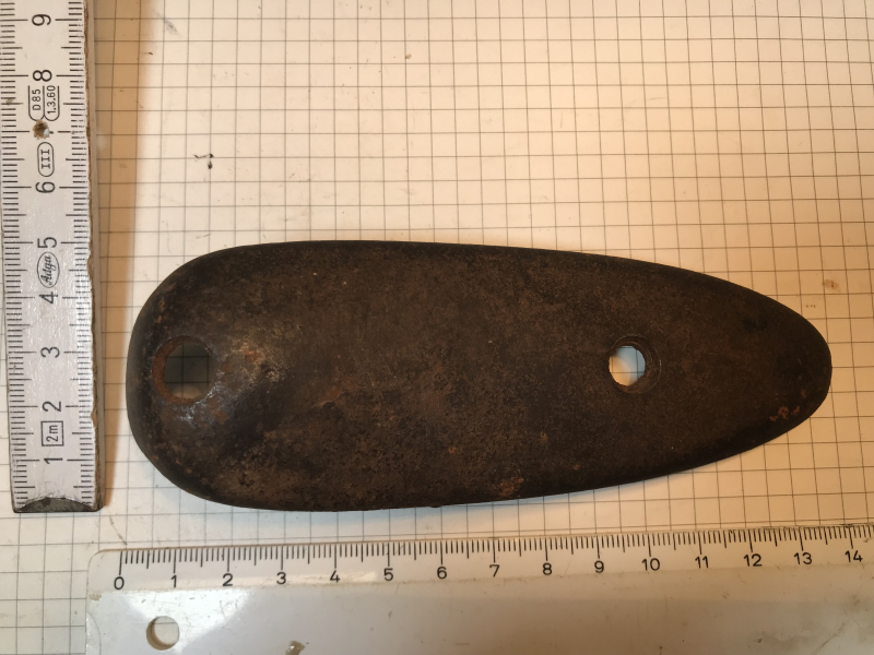 schwere Schaftkappe für Militärgewehr aus Eisen mit Schaftübergriff, 50x140cm.Leicht rostig
