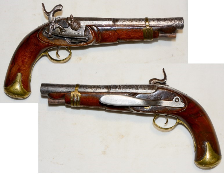 Spanische oder norditalienische Militärpistole des 18. Jahrhunderts, auf Perkussion aptiertes Miqueletteschloss, Lauflänge 18,8cm, Gesamtlänge 30cm, Kaliber 15mm, linke Seite mit Gürtelhaken, der Laufhaltering könnte auf eine spätere Verwendung auf dem Balkan hinweisen. Technisch guter Zustand ohne Mängel oder fehlende Teile, der Ladestock wurde später ergänzt, Gebrauchs- und Alterspuren