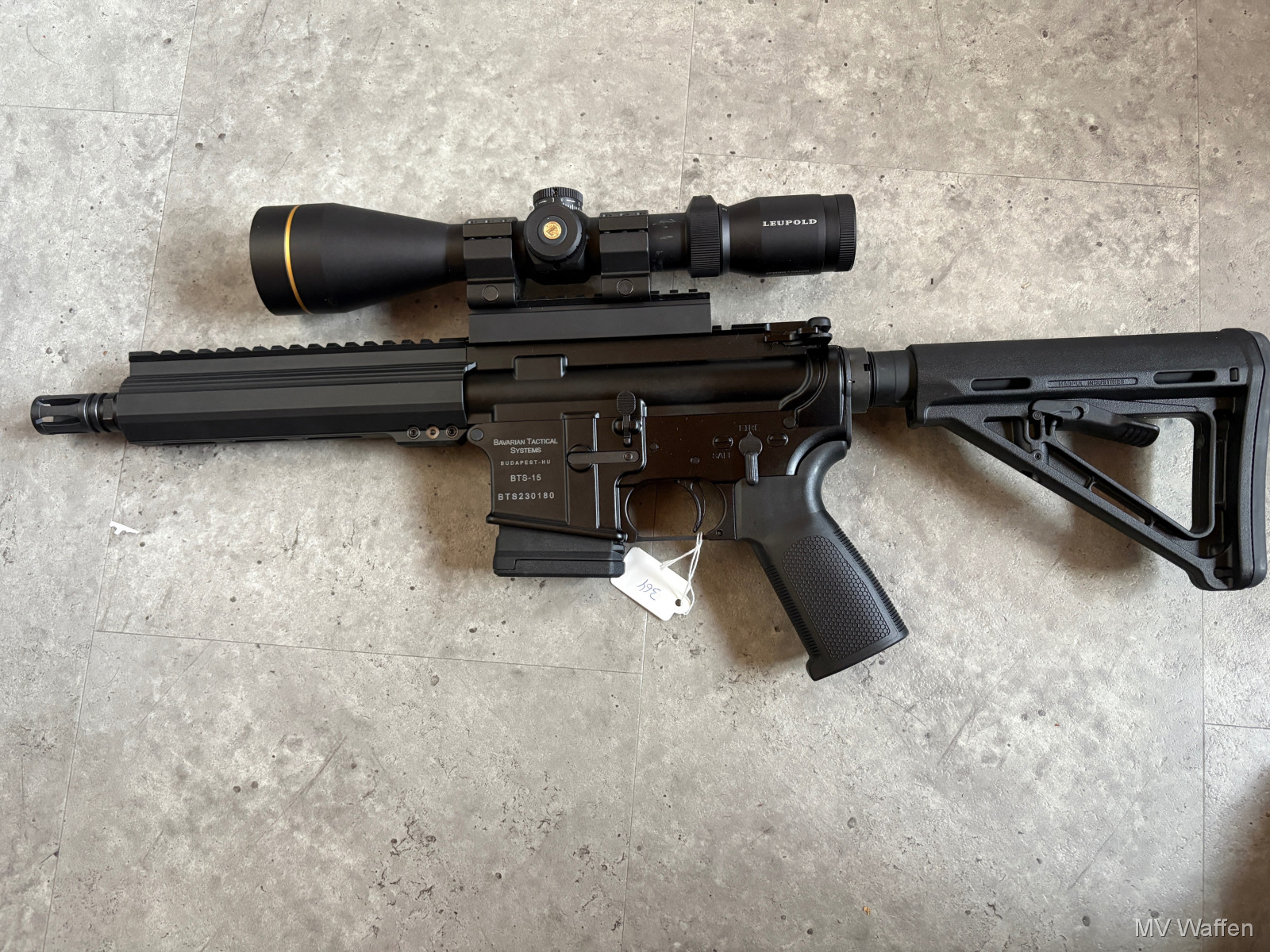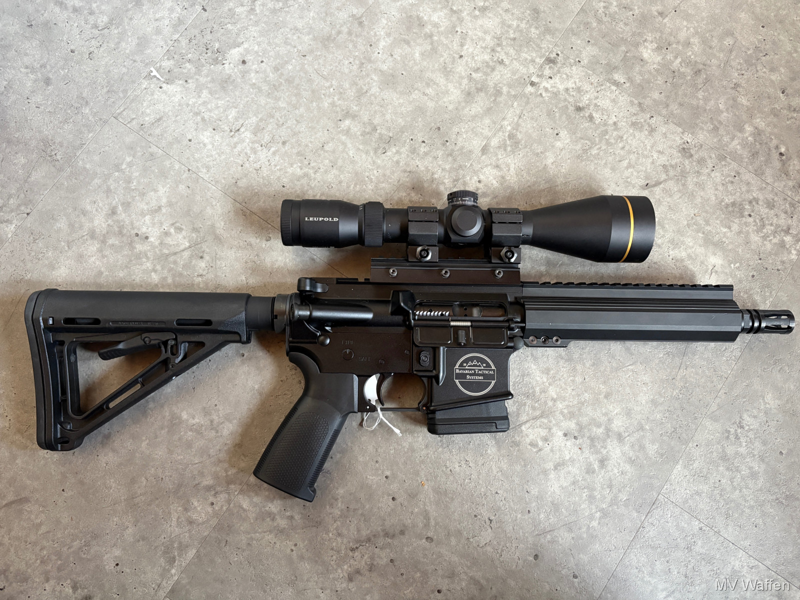 Bavarian Tactical Systems in .300 Blackout. Schöne kurze Ausführung in 9 Zoll. Sehr gute Schussleistung auf 100 Meter. Mit Schubschaft und Leupold VXR 3-9x50. Nur Probegeschossenes Vorführgerät für Sachkunde. Sehr rasante Patrone. Die Waffe ist sportlich zugelassen. Direktversand an Europäische Händler möglich. Fragen Sie bitte nach den Versandkosten. Waffe kann natürlich gerne, nach vorheriger Absprache in Wolfratshausen besichtigt werden