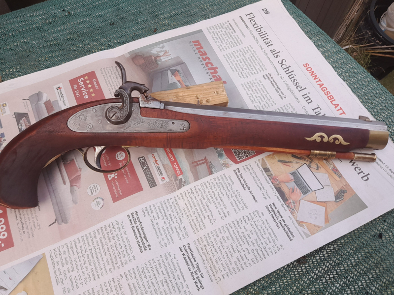 Ich biete hier eine Kentucky Vorderlader Pistole Kal 45 von einem vermutlich Spanischen Hersteller, Vertrieben von Paul Jakobi Iserlohn, an. Der Schaft ist mit Messing/Kupfer Einlagen versehen und hat eine schöne Maserung (Tiger Mapel ). Lauf von innen sauber, Schloss rastet zwei mal und schlägt stramm ab. Der Hahn schlägt mehr seitlich auf, zündet aber ohne Probleme. Bei Fragen gerne melden. Privatverkauf usw.