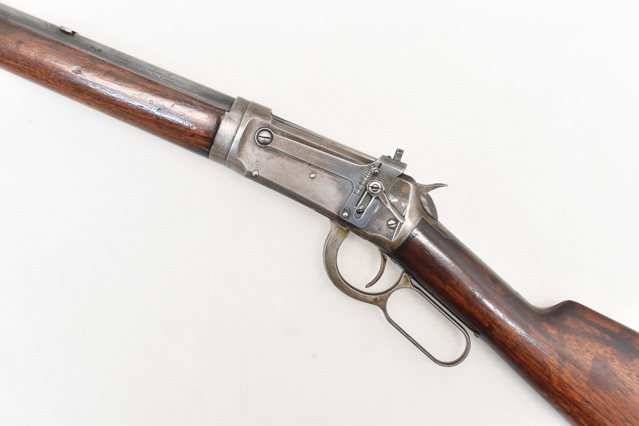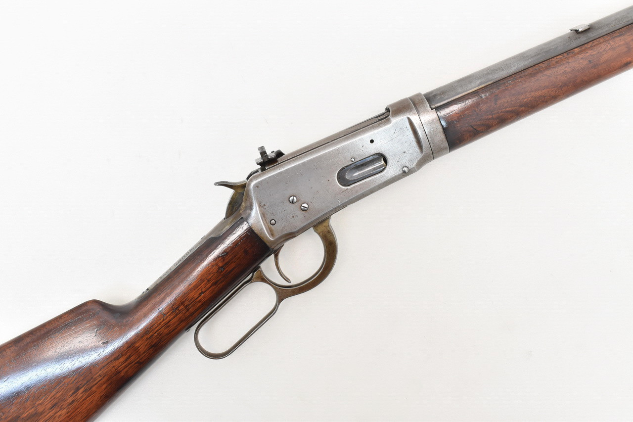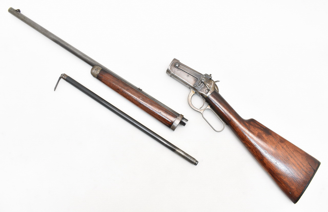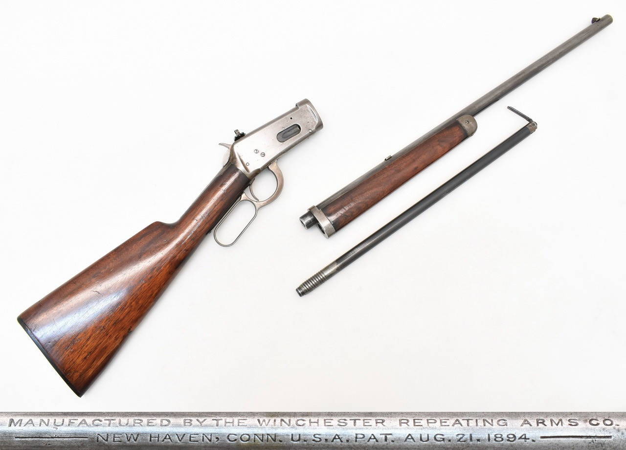 " Lever - Action " Rifle Modell 1894 aus Produktion der - Winchester Repeating Arms Co., New Haven, Connecticut - in der ohne Werkzeug zerlegbaren Take - Down Ausführung. Hergestellt im Jahre 1906. Blanker 24" Originallauf mit runder Laufkontur. Entfernte Kimme. Systemkasten mit zeitgenössischer LYMAN Receiver Sight / Lochkimme. 330mm langer Schaft für Rechts- und Linksschützen; im Bereich der Schaftnase alte Ausbesserung / Reparaturstelle ( Schaftlänge gemessen vom Abzug bis Mitte Schaftkappe ). Metallteile mit beriebener und stellenweise patinierter Oberfläche. Details siehe Bilder.