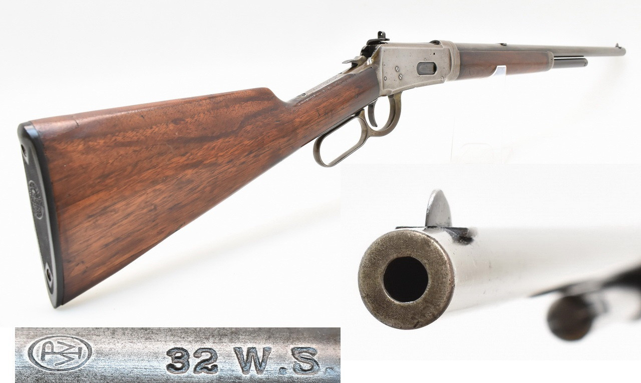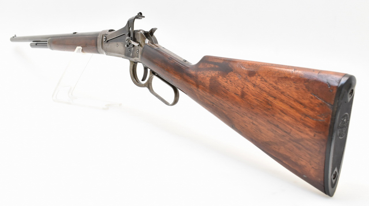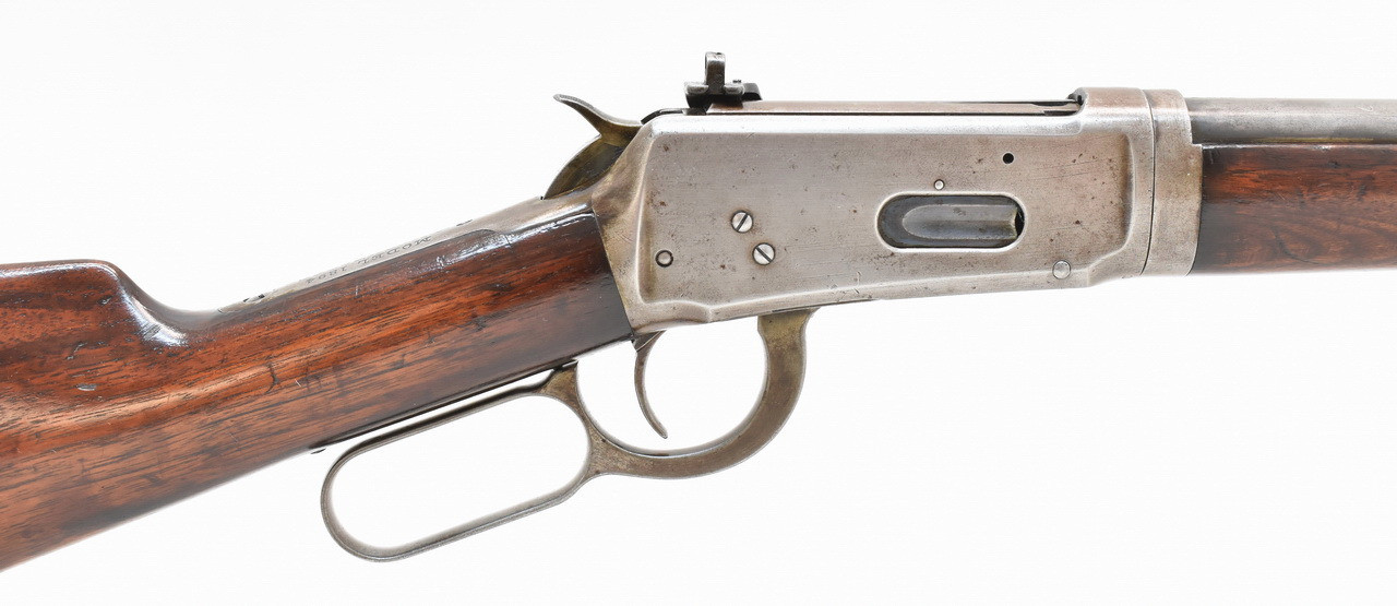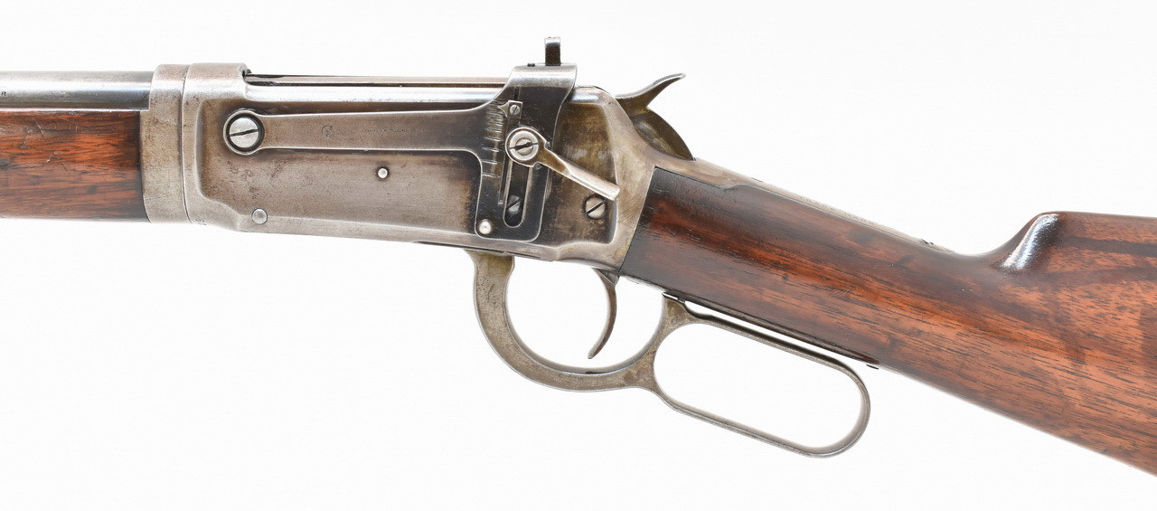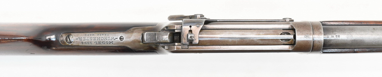 " Lever - Action " Rifle Modell 1894 aus Produktion der - Winchester Repeating Arms Co., New Haven, Connecticut - in der ohne Werkzeug zerlegbaren Take - Down Ausführung. Hergestellt im Jahre 1906. Blanker 24" Originallauf mit runder Laufkontur. Entfernte Kimme. Systemkasten mit zeitgenössischer LYMAN Receiver Sight / Lochkimme. 330mm langer Schaft für Rechts- und Linksschützen; im Bereich der Schaftnase alte Ausbesserung / Reparaturstelle ( Schaftlänge gemessen vom Abzug bis Mitte Schaftkappe ). Metallteile mit beriebener und stellenweise patinierter Oberfläche. Details siehe Bilder.