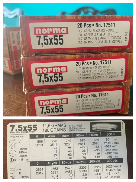 In Dieser Laborierung ist die 7,5x55 ballistisch identisch mit der Norma Oryx 30-06 180gr Ladung.