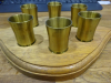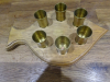 6 Schnapsstamperl auf einer Eichenplatte, hergestellt aus ungestempelten Rohhülsen für die 20mm Maschinenkanone der BW, fein ausgedreht , geweitet und poliert, schwere Qualität, kaum zu bekommen.