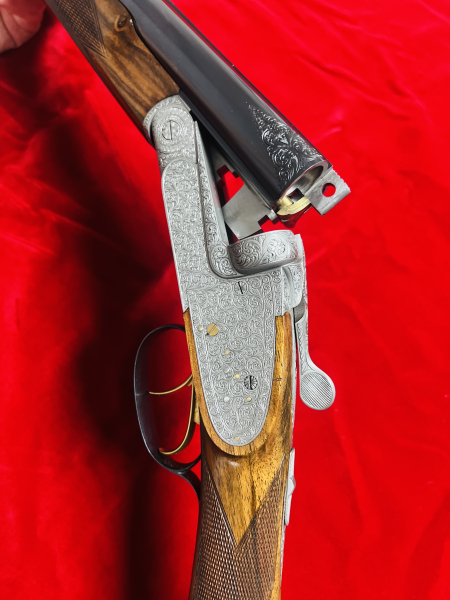 Ausgestattet ist die Flinte mit zwei Laufpaaren, die beide innen spiegelblank sind. Sie verfügt über präzise arbeitende Holland & Holland-Schlösser, Ejektor sowie eine klassische englische Schäftung, die sich harmonisch in das edle Gesamtbild einfügt. Das Baskül ist voll graviert – eine feine, meisterhafte Gravurarbeit, die das hochwertige Erscheinungsbild unterstreicht.