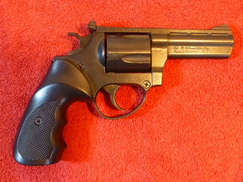 LEP Revolver Cal. 5,5mm Diabolo für 5 Druckluftpatronen – mit "F"- Zeichen – neuwertiger Zustand, nur Probegeschossen – mit Zubehör – ohne Patronen – siehe Bilder – Privatverkauf