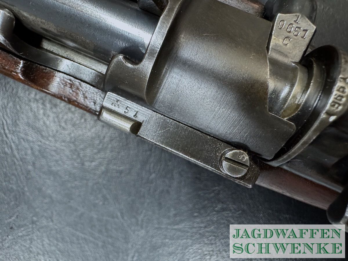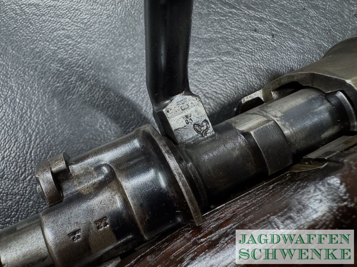 Repetierbüchse Mauser 98k im Kaliber 8x57IS WKII, gestempelt mit 1937 Portugal-Kontrakt WaA Abnahmestempel Nummerngleich , sowie vielen weiteren WKII Stempeln wie z.B. WaA63, Adler, etc..