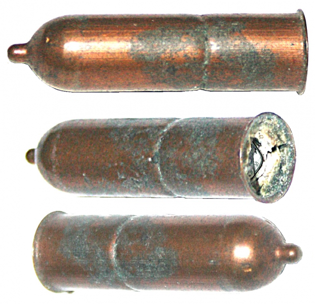 Sie bieten auf eine seltene seltene amerikanische " Titfire " Revolverpatrone Kal. .32. aus den Jahren 1864 - 1870. Die Zündung befindet sich in einer halbkugelförmigen Ausbeulung am Patronenboden. Sie wird zur Umgehung des Rollin White Patenes ( durchbohrte Trommel ) von vorne in die Revolvertrommel geladen. Die weißen " Krümel ! im Patronenhals sind die verhärteten Reste des Patronenfettes und können leicht entfernt werden. Weiteres siehe Fotos, sie zeigen den Gegenstand dieser Auktion. Eigenverkauf aus Sammlungsauflösung