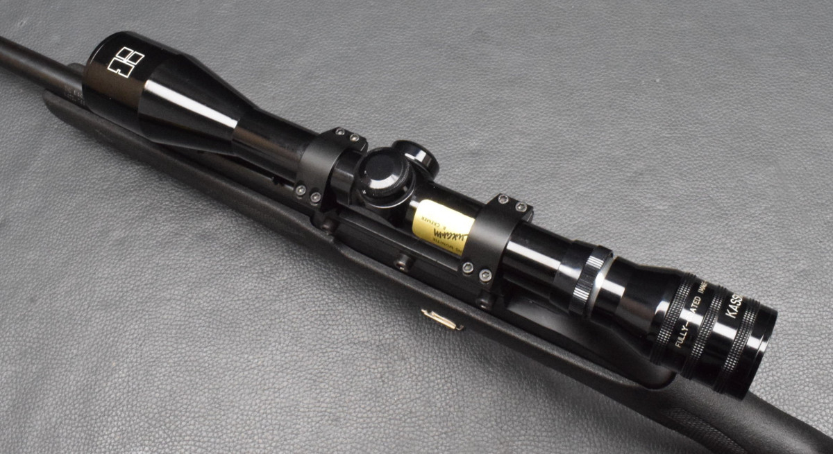montiert mit ZF Kassnar 10x40 Abs. Plex, mittels Aufkippmontage mit 25,4mm Ringen. Kunststoffschaft mit Riemenbügelbasen.