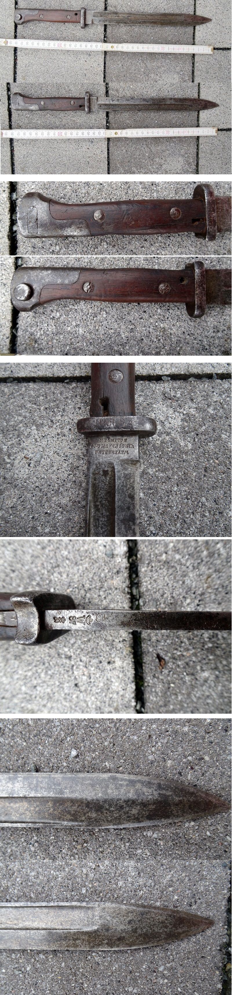 Zur Versteigerung kommt ein Bajonett 84/98, alter Art, "WEYERSBERG KIRSCHBAUM & Co, SOLINGEN" W87, schöner, gebrauchter Zustand. Dachbodenfund unberührt. Das Bajonett ist gestempelt mit W87. Alles Weitere entnehmen Sie bitte den Bildern. Verkauf aus Ankauf ,Erbschaft oder Komission. wird das Garantie- u. Rückgaberecht für diesen Artikel ausgeschlossen. Käufer trägt Versandkostenpauschale von 10,00 Euro. Vorbesichtigung nach Absprache erwünscht. Korospontenz und Versand nur Freitag, Samstag und Sonntag. Firma Vogel GbR, Waffenhandel, Oberschweinach 1, 91413 Neustadt.
