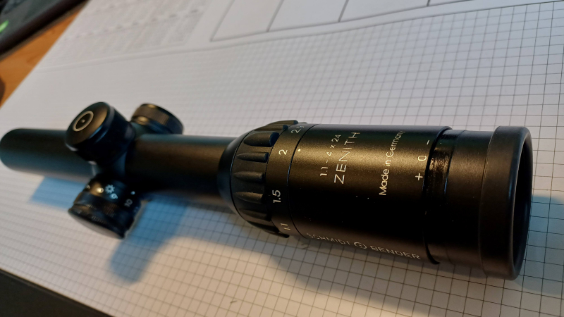 Angeboten wird ein Schmidt & Bender Drückjagdglas 1,1-4x24 Zenith mit Leuchtpunkt.