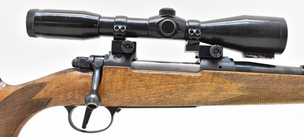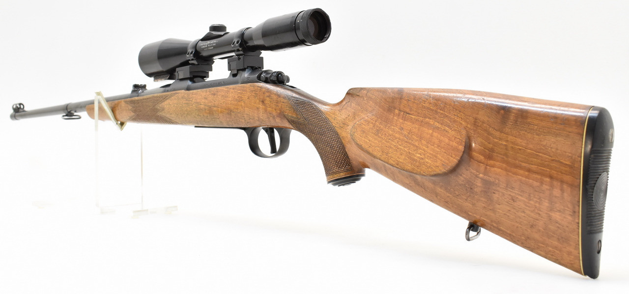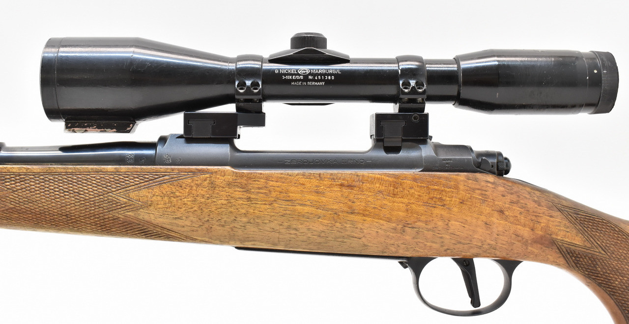 Tschechischer Repetierer mit Klappdeckelmagazin. Achtung! Patronenzubringer und Feder fehlen!!! Der Lauf ist spiegelblank, montiert ist ein Nickel Supra 3-10x Abs. 4. Schaftlänge 37cm, gemessen Abzug bis Mitte Schaftkappe. Beschuss von 1967.