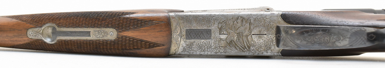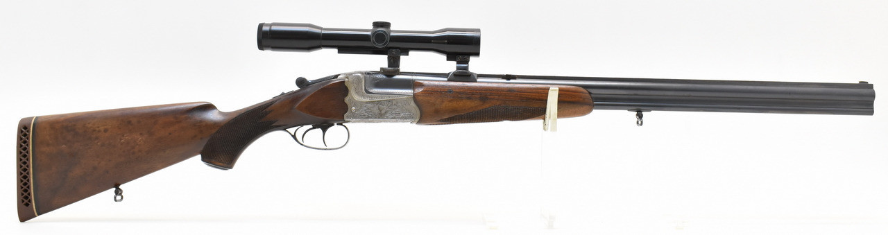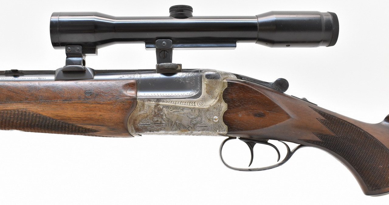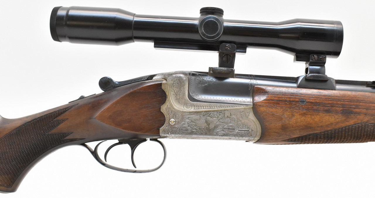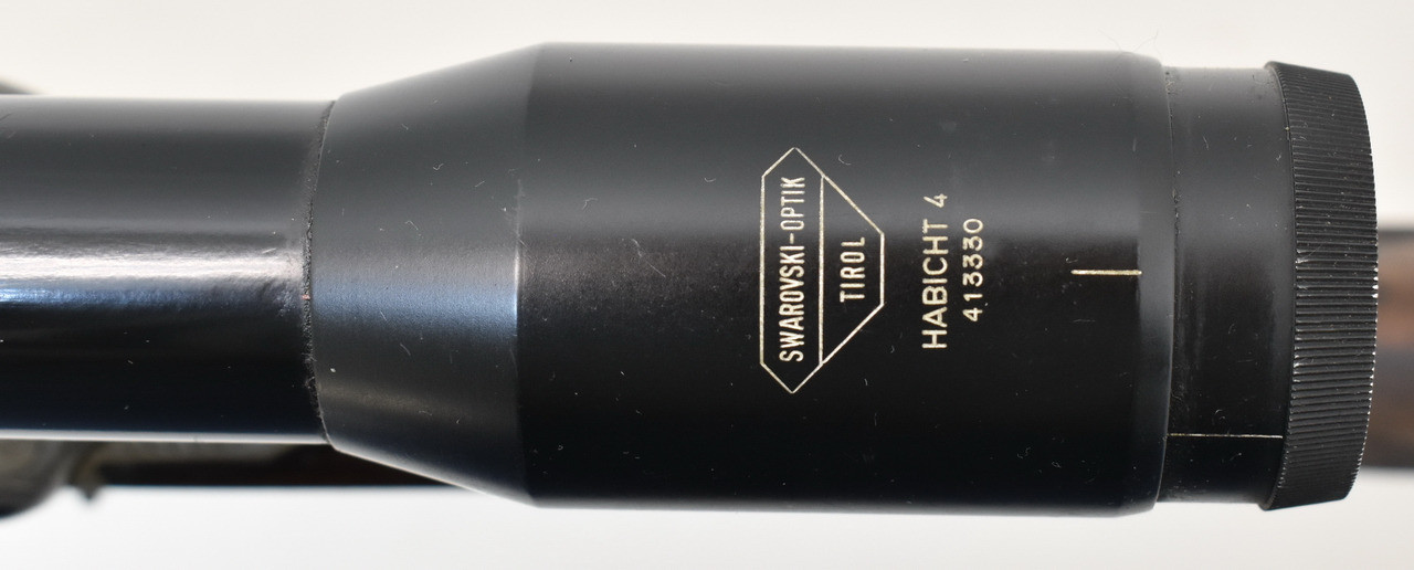 Stahlsystemkasten mit Tiergravur. Französischer Rückstecher im vorderen Abzug. Blanke Läufe aus Special Gewehrlaufstahl. Brünierung und Basküle partiell mit Rostnärbchen. Die Waffe ist auf einer SEM mit einem ZF Swarovski Habicht 4x32 Abs. 1 montiert. Dichter Verschluss, Beschuss von 01/65. Schaftlänge 38,5cm gemessen vom vorderen Abzug bis Mitte Schaftkappe.