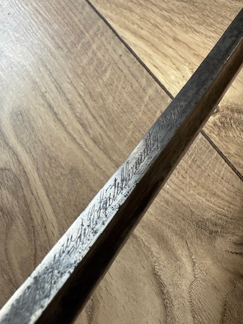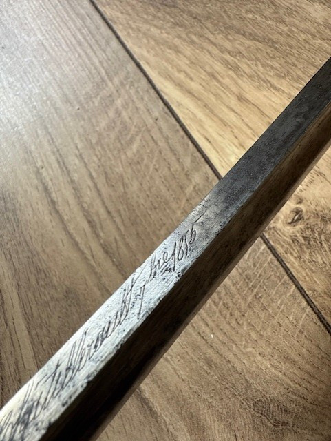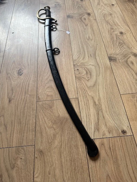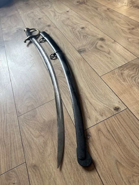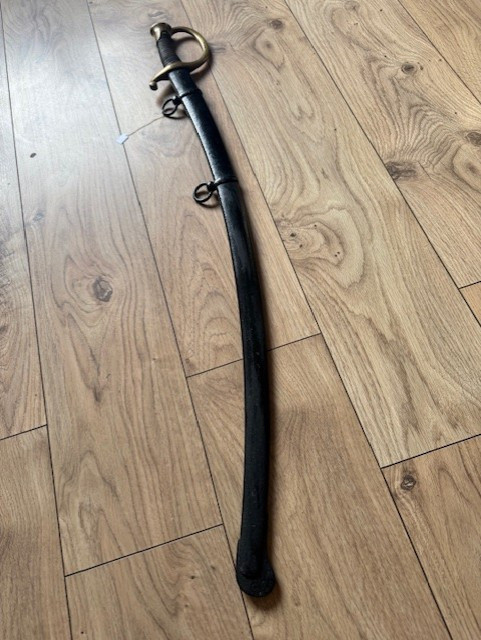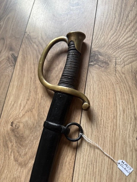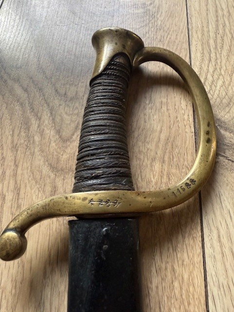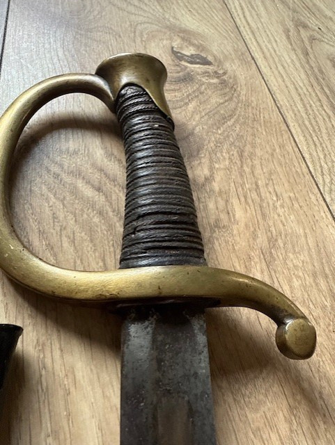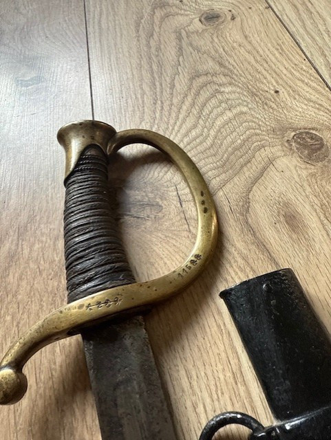 Sabre de troupe d'Artillerie à cheval modèle de 1829. Kammerstück 1835. Stärker geschwungene, an der Wurzel ca. 3.3 cm breite und 81,5 cm sehr lange Klinge,Gesamtlänge beträgt 99 cm beiderseitig mit breiter Hohlbahn, terzseitig auf der Fehlschärfe mit Kontrollpunzen, auf dem Rücken verputzte Hersteller «[M]anuf-Rle [de] [C]hâtellerault [Nov] 1835», die Klinge fleckig und schartig. Messinggefäß mit einfachem Parierbügel, dieser mit diversen Stempeln, belederter Holzgriff, die Drahtwicklung fehlt weitestgehend. Brünierte Stahlscheide mit zwei Ringbändern und beweglichem Trageringen.