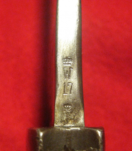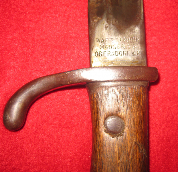 Sie bieten auf ein gekürztes, deutsches SG 98/05 mit Scheide ohne Feuerschutzblech, vermutlich Türkei M35, Hersteller: Waffenfabrik Mauser A.G., Oberndorf a.N. Zustand: siehe Fotos. Klingenrücken gestempelt mit Krone über W 17. Parierstück mit der Nummer 4612. Drücker ist gängig. Die gekürzte 98/05 Scheide hat einen aufgesetzten Tragehaken. Die gekürzte 98/05 Klinge wurde annähernd auf die gleiche Breite gebracht. Gesamtlänge mit Scheide: 405mm, Klingenlänge: 250mm, Gesamtlänge ohne Scheide: 380mm. Altersnachweis erforderlich. Versandkosten ins Ausland sind höher. Da Privatverkauf, keine Garantie, keine Rücknahme möglich.