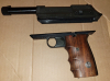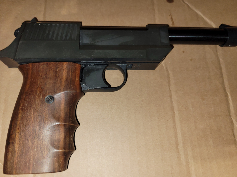 Sie bieten hier auf eine absolute Rarität auf dem Schreckschuss Markt. Die Pistole EM-GE 65, im Kaliber 22 knall. 10 schüssiges Magazin. PTB 459. Beschuss Ulm. Made in West Germany. Dieses Modell besitzt keine Laufsperre da das Magazin unter dem Lauf liegt. Ähnlich der Röhm RG 600. Abschussbecher ist im Lauf integriert. Mit einem Knopfdruck kann der Lauf abgenommen werden, und es könnte das Stakato Magazin aufgesetzt werden. Holzgriffschalen. Aussehen wie die Walther P38. Ein sehr interessantes Stück Geschichte. Wird so nie mehr produziert werden.