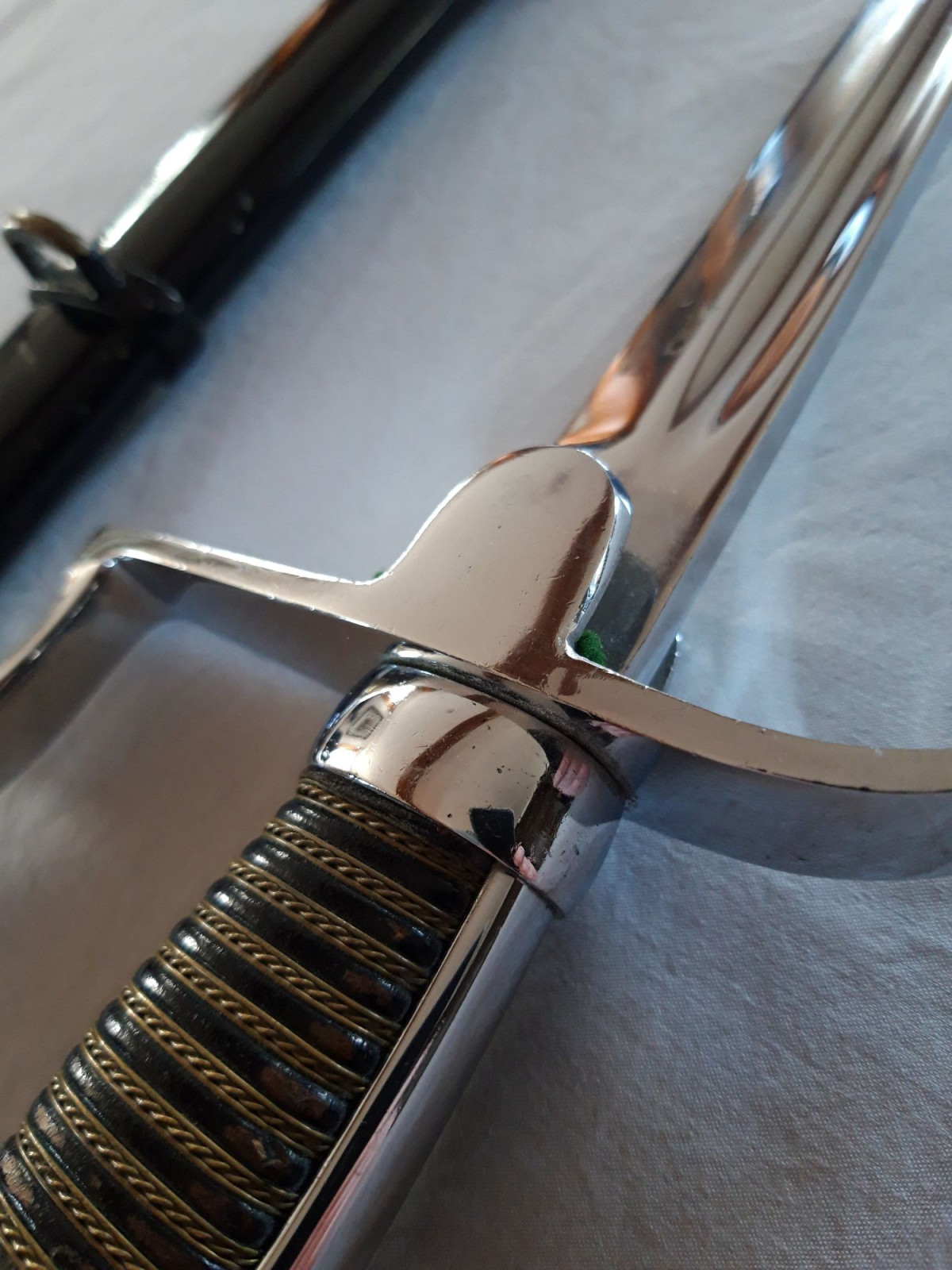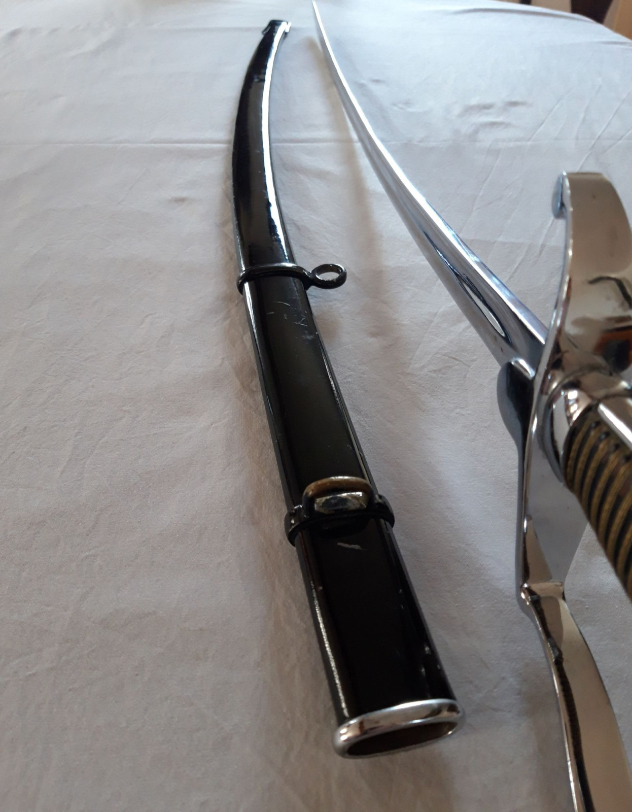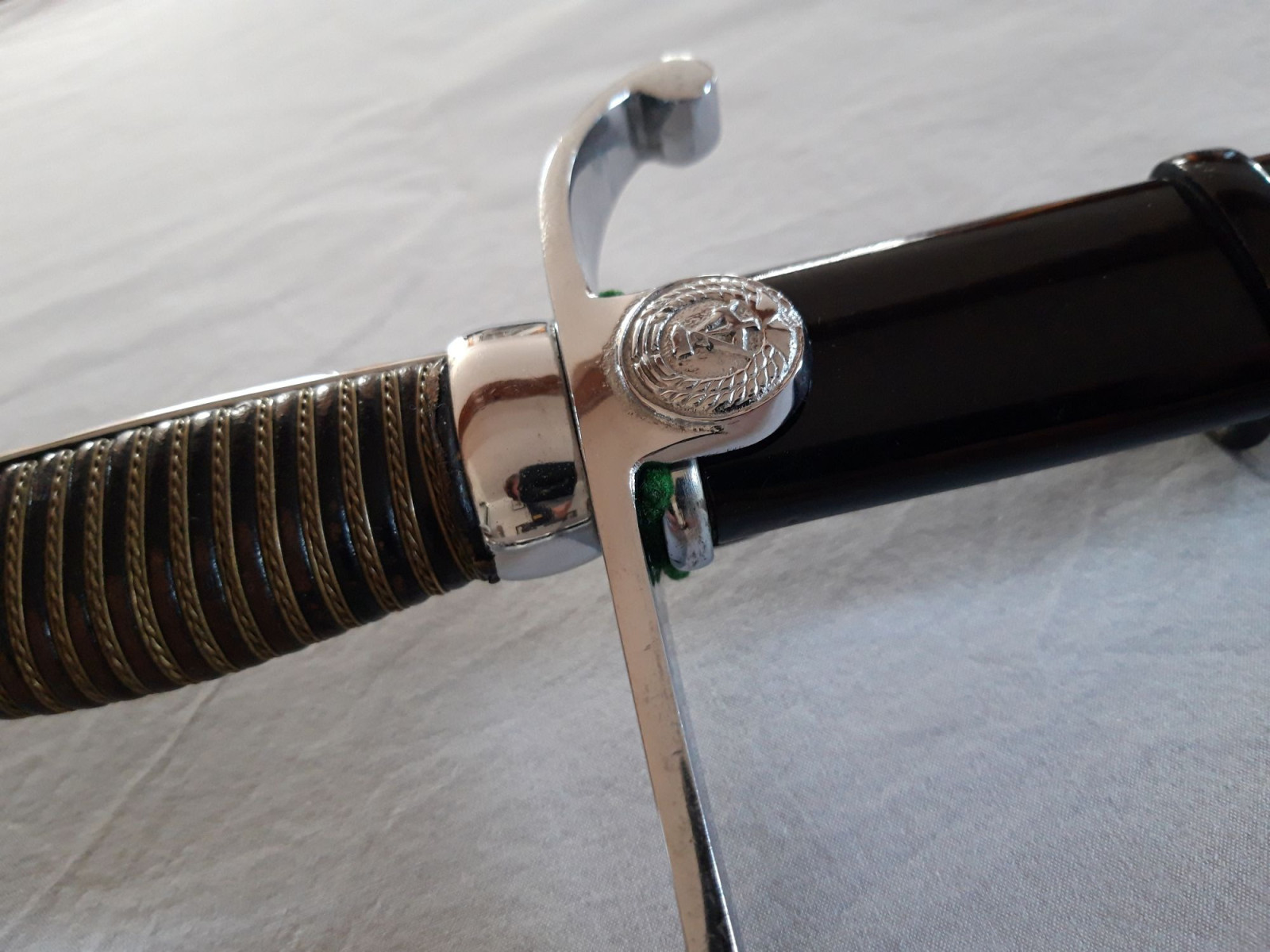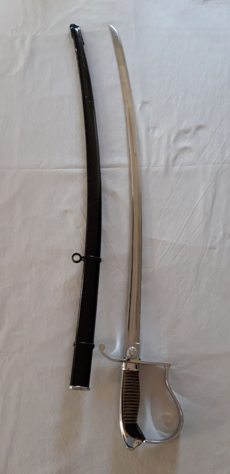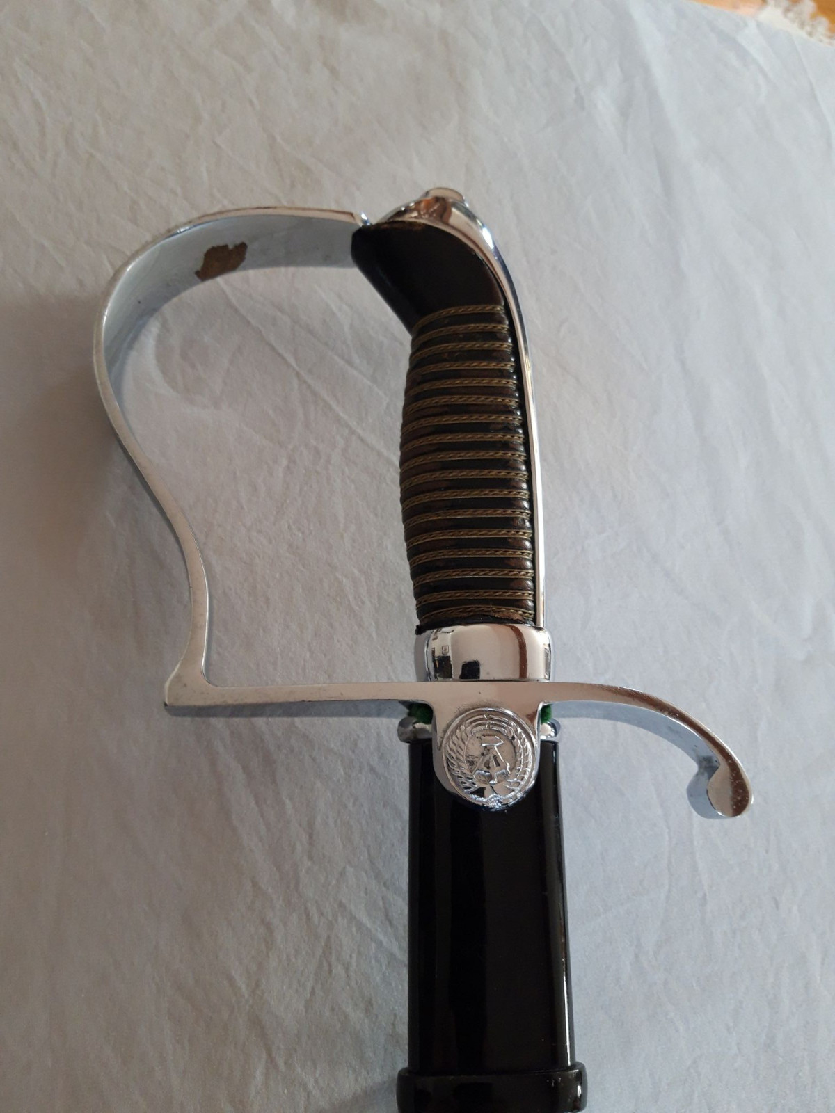 NVA / MfS Paradesäbel der DDR Produktion 1. Variante mit aufgesetzten DDR Logo und ohne Nummer. Zustand ist gut, Scheide 95 % im Originallack. Am Gefäß kleine Abriebstelle durch Benutzung. Gesamtlänge: 95 cm, Scheide: 83 cm, Klinge bis Gefäß: 78 cm, Säbel ges. o. Scheide 91 cm. Bezahlung über PP Freunde möglich, Banküberweisung oder Abholung in 04610 Meuselwitz