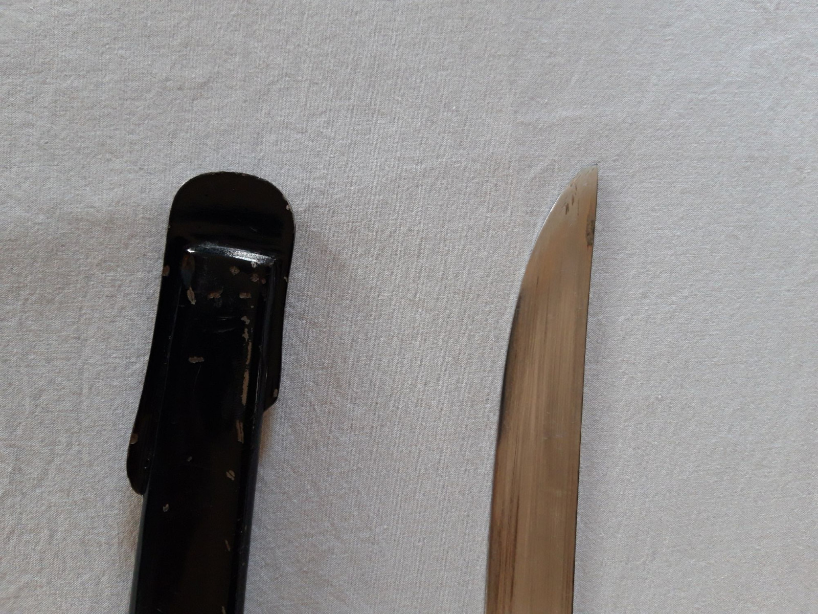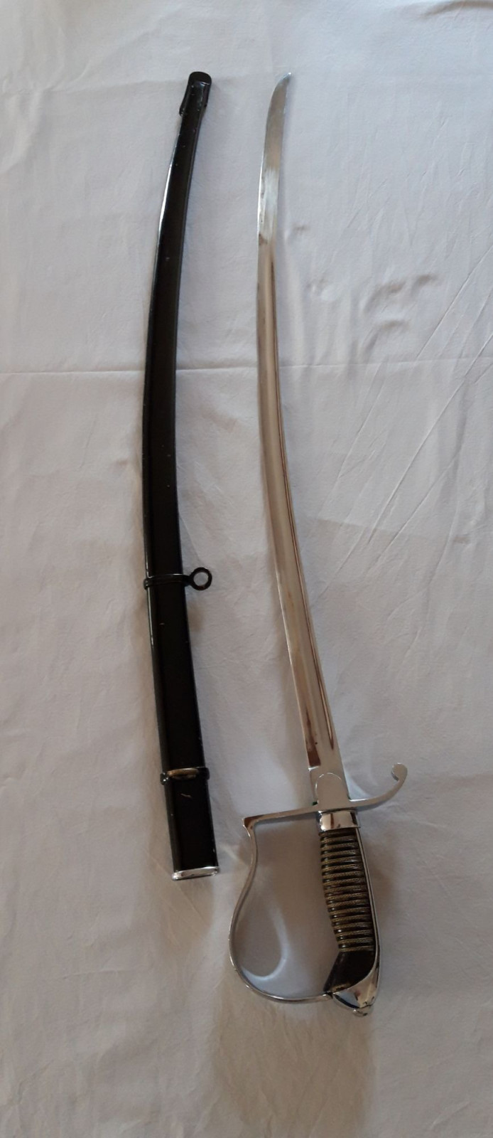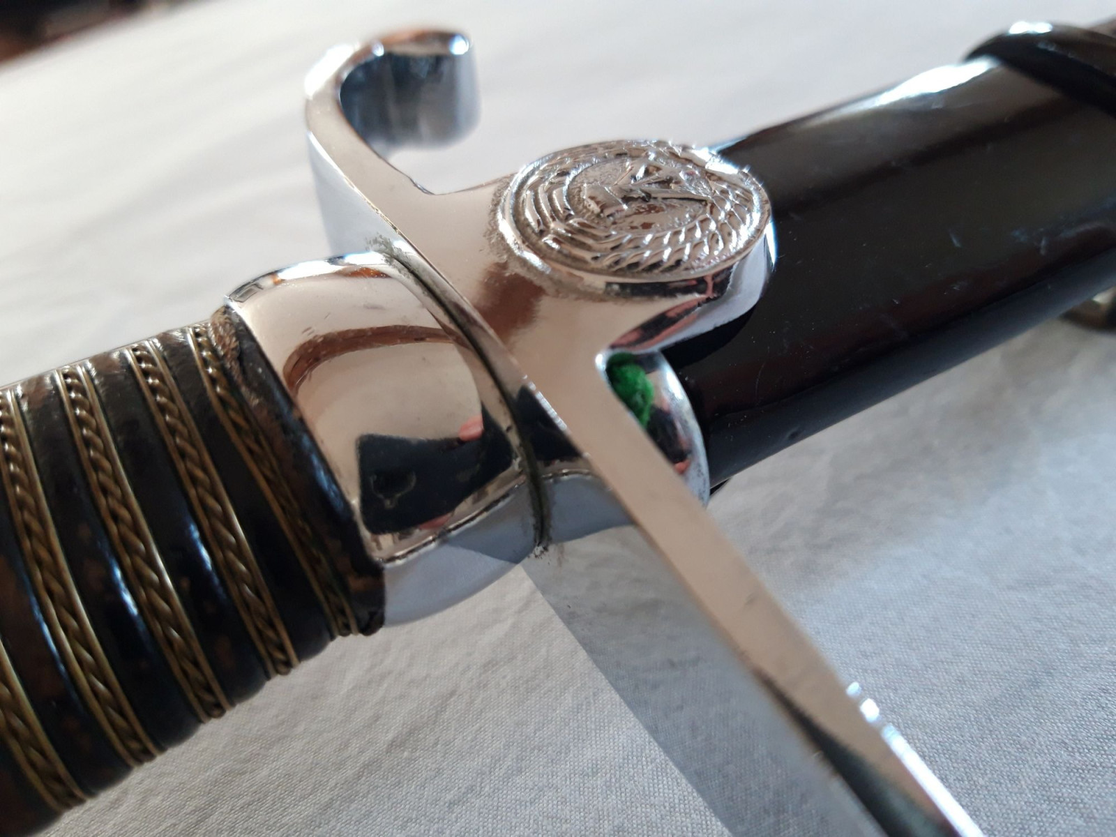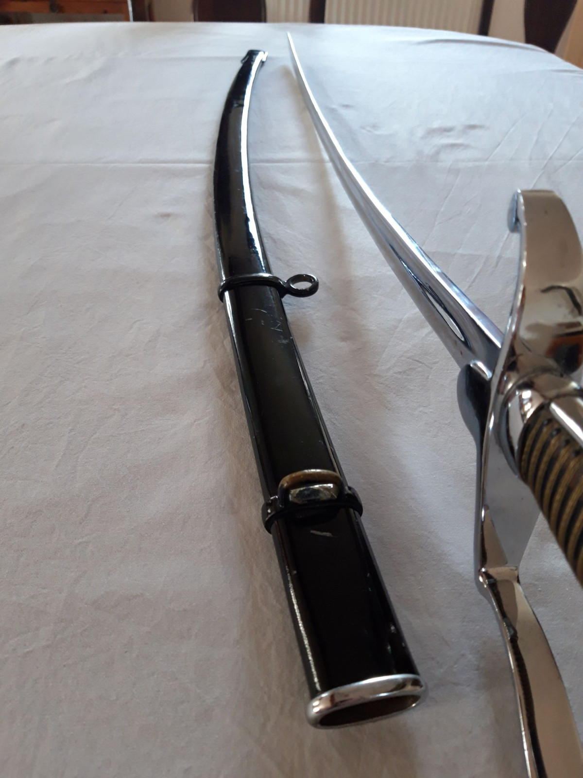 NVA / MfS Paradesäbel der DDR Produktion 1. Variante mit aufgesetzten DDR Logo und ohne Nummer. Zustand ist gut, Scheide 95 % im Originallack. Am Gefäß kleine Abriebstelle durch Benutzung. Gesamtlänge: 95 cm, Scheide: 83 cm, Klinge bis Gefäß: 78 cm, Säbel ges. o. Scheide 91 cm. Bezahlung über PP Freunde möglich, Banküberweisung oder Abholung in 04610 Meuselwitz