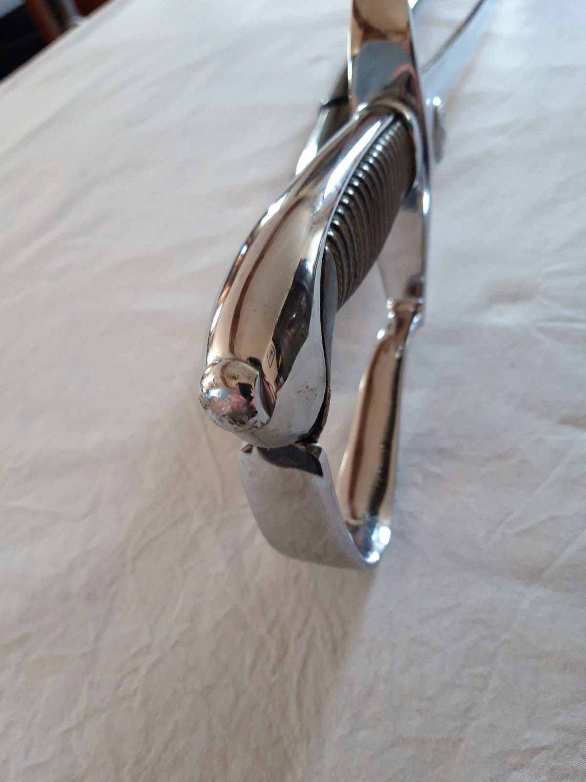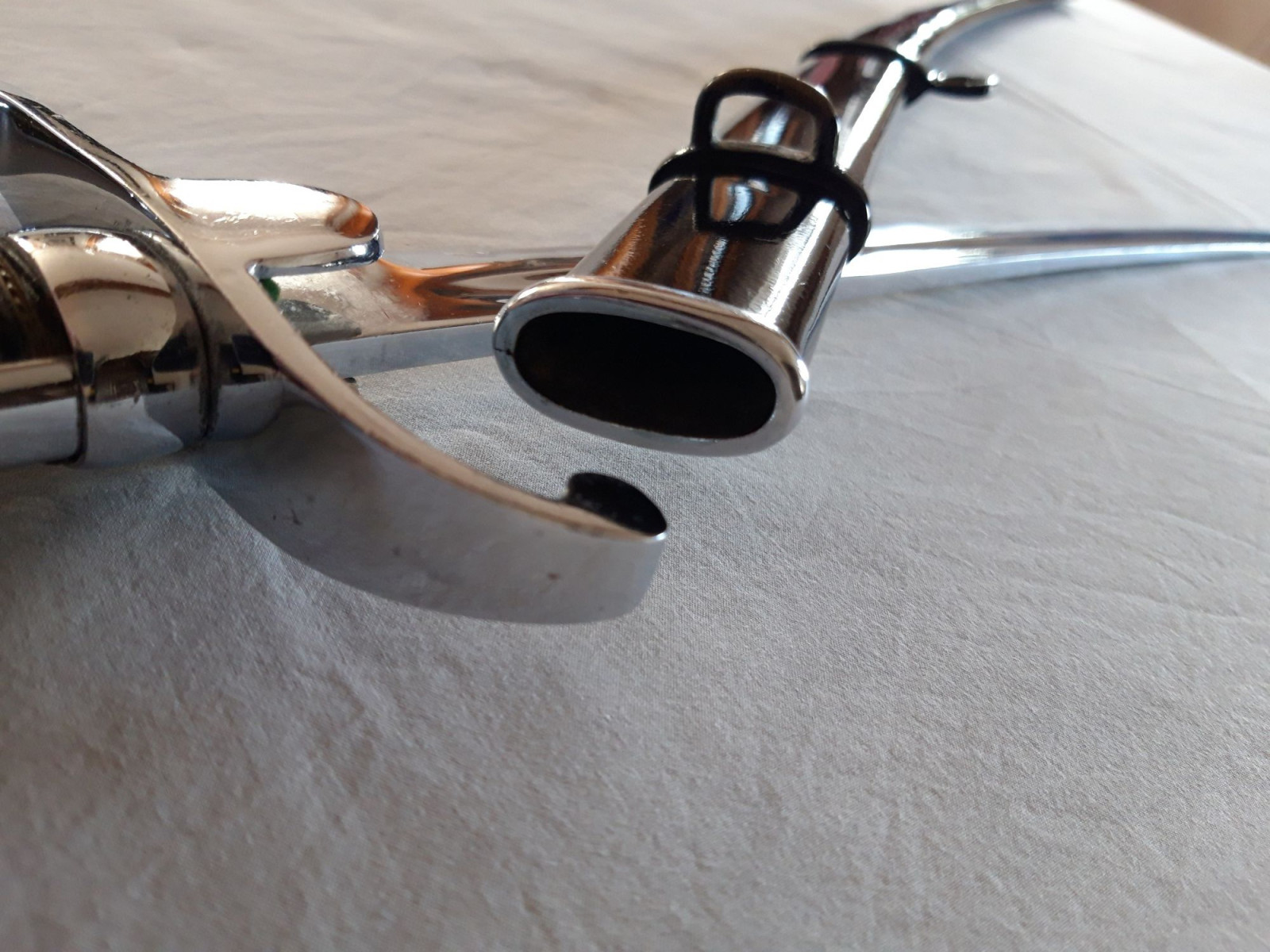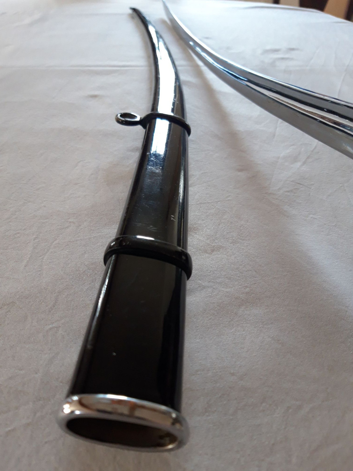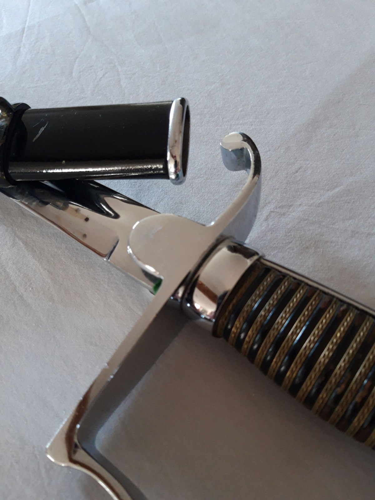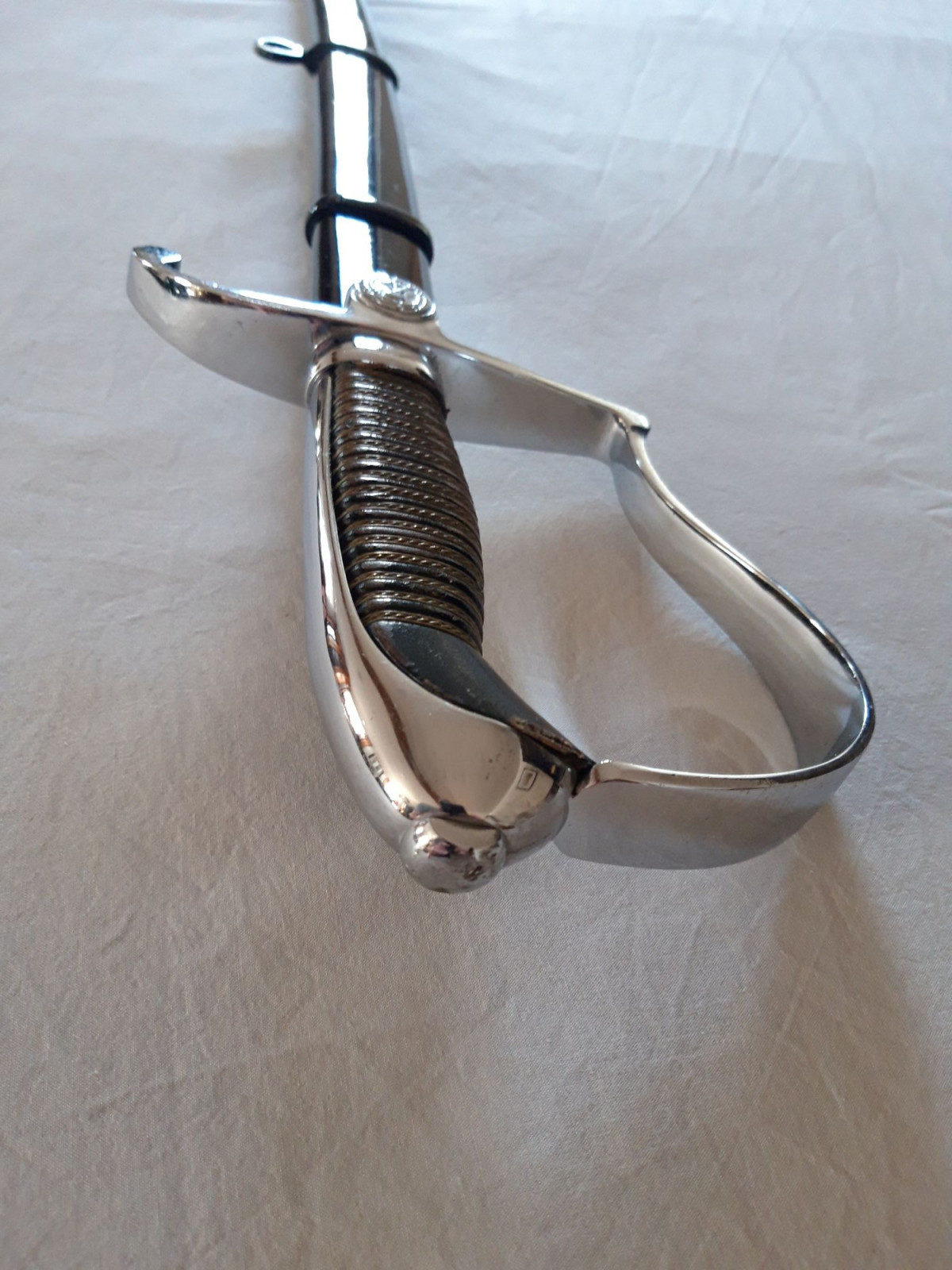 NVA / MfS Paradesäbel der DDR Produktion 1. Variante mit aufgesetzten DDR Logo und ohne Nummer. Zustand ist gut, Scheide 95 % im Originallack. Am Gefäß kleine Abriebstelle durch Benutzung. Gesamtlänge: 95 cm, Scheide: 83 cm, Klinge bis Gefäß: 78 cm, Säbel ges. o. Scheide 91 cm. Bezahlung über PP Freunde möglich, Banküberweisung oder Abholung in 04610 Meuselwitz