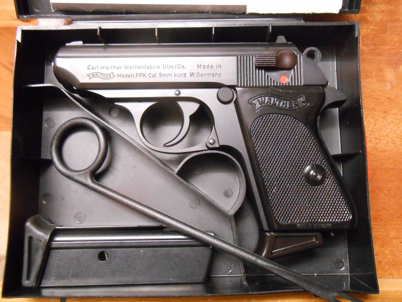 Ungeschossenen Walther PPK im kal 9mm kurz, Beschuss KC, Waffe komplett mit Res Magazin, Anschussscheibe, Putzstock in Plastikbox.