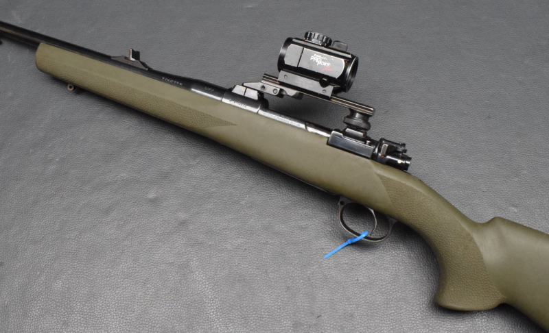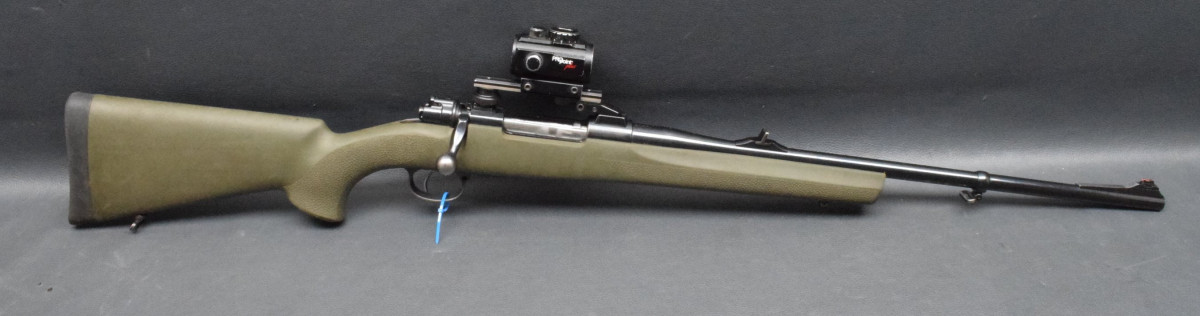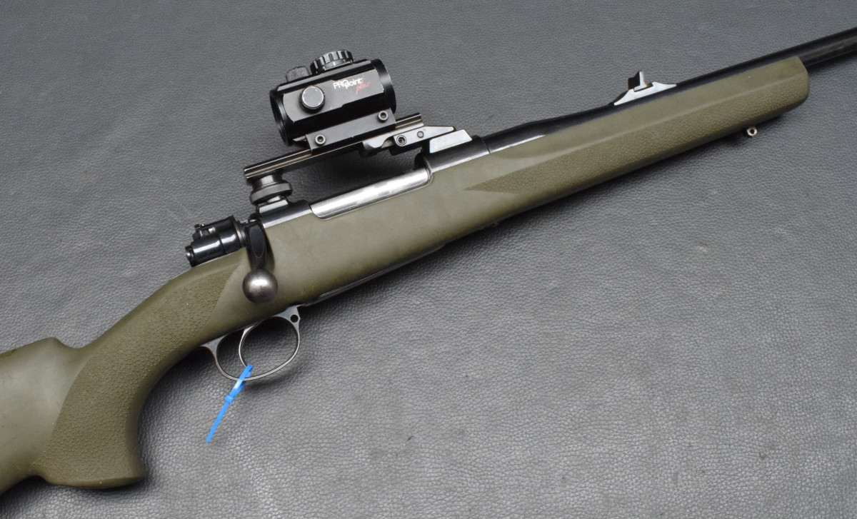 mittels EAW Schenkmontage. Gummierter grüner Schaft von Hogue mit Schaftkappe und Riemenbügeln.