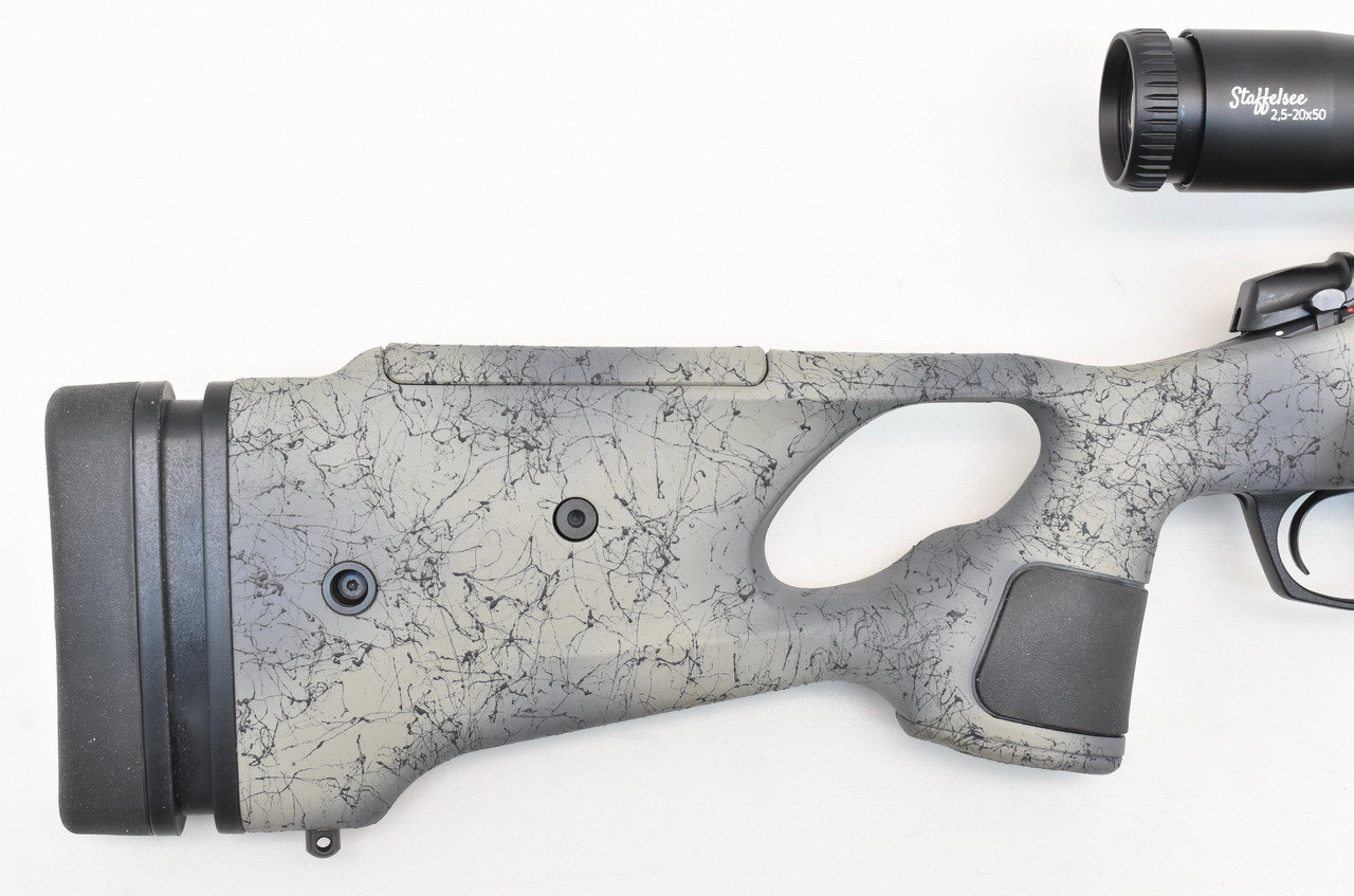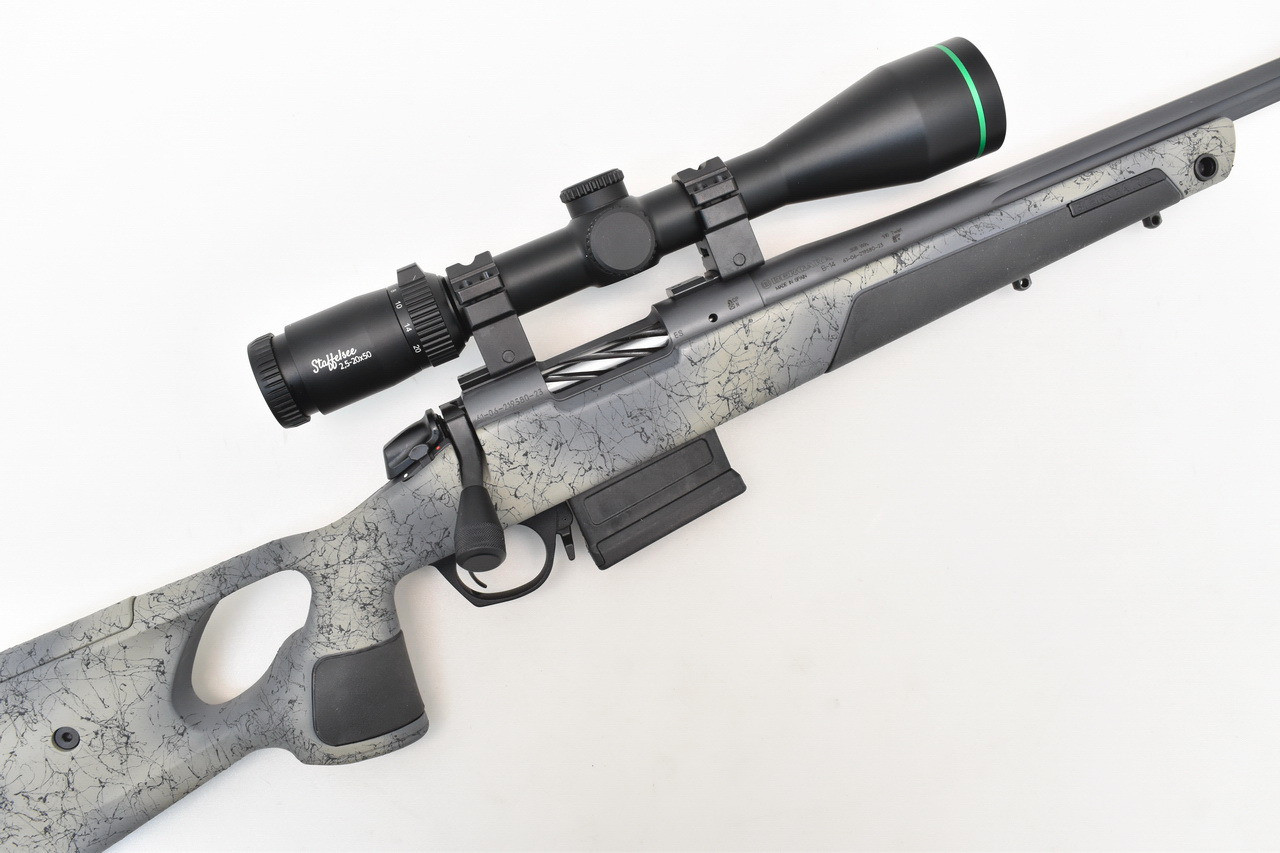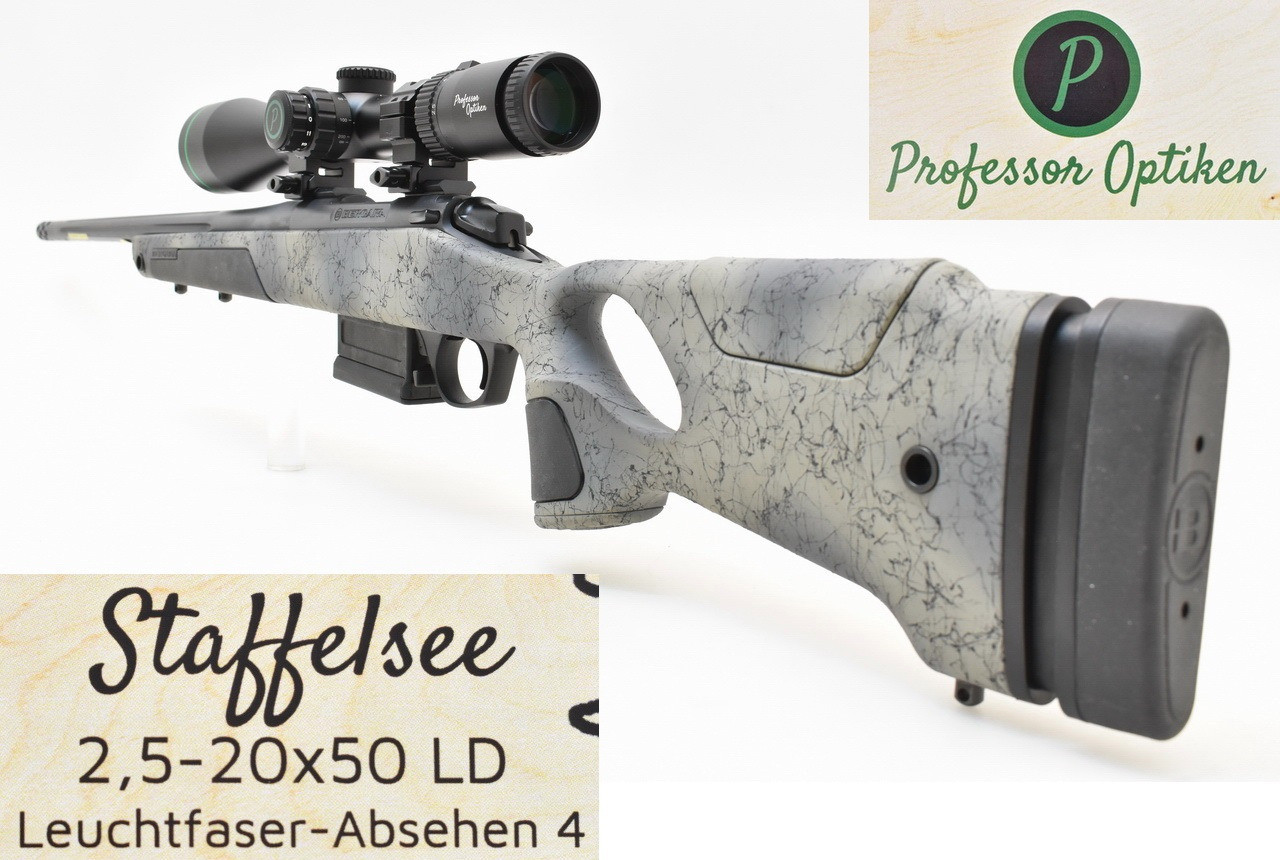Präziser Repetierer für extremste Einsatzbedingungen. Die Bergara B 14 " Wilderness Thumbhole ". Stahl - Verschlußhülse. Kannelierter Zylinderverschluß mit 2 - Warzen Verriegelung und vergrößertem Kammerstengelgriff. System und Lauf in Sniper Grey Cerakote beschichtet. Trockenstehender Direktabzug. Seitliche 2 - Stellungs - Schiebesicherung. Einfach zu entnehmendes AICS Style Einsteckmagazin. Spiegelblanker 20" / 503mm langer Präzisionslauf mit 5/8-24 UNEF Laufgewinde und Mündungsbremse. 333mm langer, Wilderness Camo Kunststofflochschaft für Rechtsschützen mit höhenverstellbarer Schaftbacke und Gummischaftkappe ( Schaftlänge gemessen vom Abzug bis Mitte Schaftkappe ). Pistolengriff und Vorderschaft mit SoftTouch Inlays. Schaftlänge mittels Distanzstücke verlängerbar. Variables PROFESSOR OPTIKEN Zielfernrohr 2,5 - 20 x 50 LD " Staffelsee " mit 11 - fach verstellbarem Leuchtfaser - Absehen 4 ( Leuchtpunkt ) und seitlichem Parallaxenausgleich. Objektivaußendurchmesser 59,6mm. UTG Max Strength Quick Detachable Twist Lock ZF - Montage. Augenabstand 290mm.