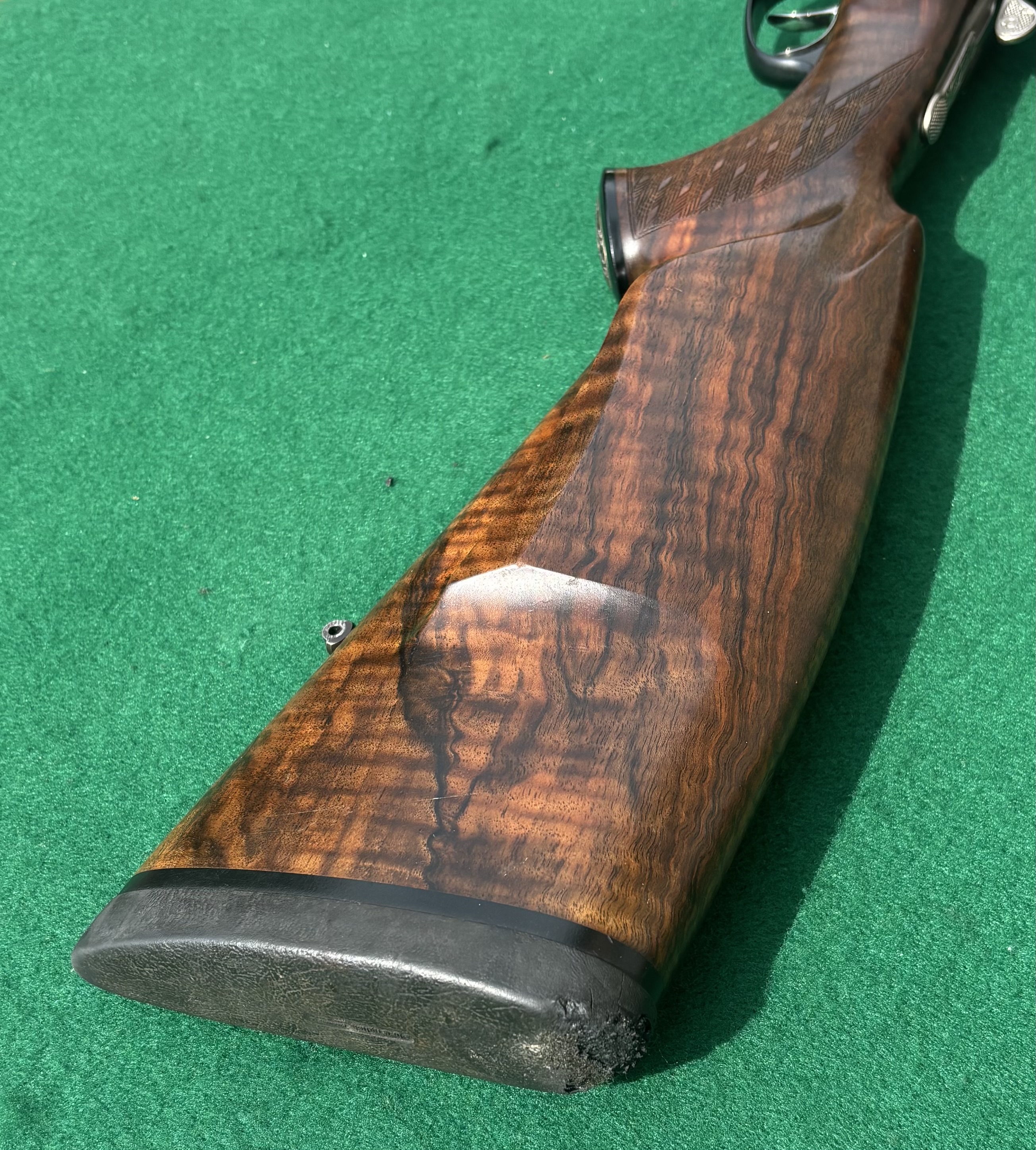 Schaft: Hochwertiger, handgeölter Nussbaumschaft mit ausgeprägter Flammenzeichnung. Sehr schöne Farb- und Maserungsstruktur (~ HK 7-9), besonders edel und typgerecht für handgefertigte Prinz-Waffen