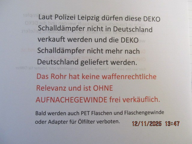 Wer an diesem Dämpfer ohne Behördliche Genehmigung ein Anschlussgewinde für den Lauf anbringt, macht sich strafbar! Der Dämpfer ist ohne Laufanschlußmöglichkeit und somit für Jedermann frei zu erwerben. Dieses Bauteil hier kommt mit Bohrungen von 10mm an beiden Seiten, ist daher kein waffenrechtliches Teil !! Es kann in diesem Zustand an keiner Waffe befestigt werden! Ich habe keine mit Gewinde und biete das unter keinen Umständen an! Weitere Arbeiten eines metallverarbeitenden Betriebes oder Büchsenmachers wären nötig! Es kann über Büchsenmacher mit Herstellungserlaubnis den Weg in eine WBK finden = geringe weitere Kosten Waffengesetze sind in jedem Fall zu beachten - unseriöse Anfragen werden nicht beantwortet, und sind zu unterlassen!