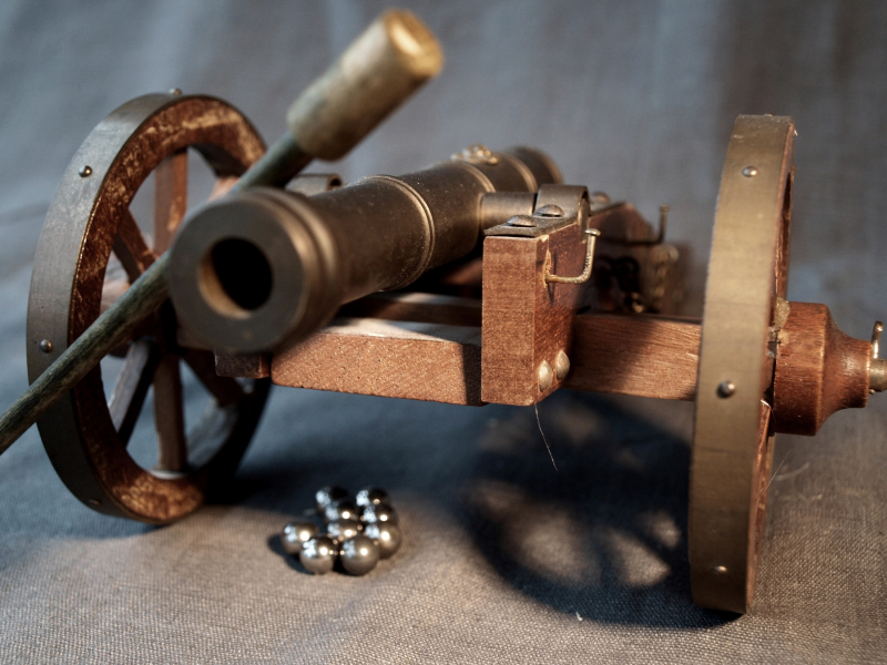 Biete ein ordentlich gefertigtes Modell einer barocken Feldkanone, also eines Feldgeschützes aus der Zeit um 1730. Unser knapp 30 cm langes und 17 cm achsbreites Kanonenmodell entspricht in Maßstab und Details seinem barocken Vorbild. Das bronzene Geschützrohr im Cal. 10 mm ist mit dem 2 mm Zündloch verbunden. Es ist in der Ausführung typisch für seine Zeit – die klassische Kanonierung, wohl proportionierte Stoßbodentraube und zwischen Schildzapfen und Zündloch prangt ein Löwenkopf. Das grau-braun patinierte Bronzerohr ruht auf einer komplett aus Teakholz gefertigten Wangenlafette, an welcher sich links der Setzkolben befindet. Die metallernen Beschlagteile sind ebenso wie die Radreifen aus Messing gefertigt. Das gold-braune Messing harmoniert wunderbar mit dem rötlichen Teakholz. Es handelt sich um ein hübsches und ansehnliches Modell eines Feldgeschützes aus dem Barock.