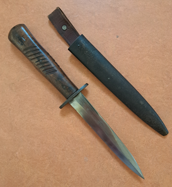 Verkaufe einen sehr gut erhaltenen Grabendolch, Initialen "EF" am Griffende, 3 Einkerbungen = 3 x Nahkampfeinsatz !!! 3fach genietete Holzgriffschalen.