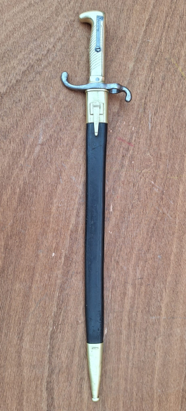 Biete sammelwürdiges, sächsisches Seitengewehr M/71 mit orginal Scheide vom 181. Inf.-Regiment. Truppenstempel vom selbigen Regiment, aber Kompanie-Nummern differieren. Das 181. R. wurde am 1.April 1900 errichtet. Das 1. Battalion (1.-4. Komp.) wurde durch das aufgelöste 3.Jäger-Battalion Nr.15. /Wurzen aufgestellt. 2. u. 3. Battalion (5.-12. Komp.) durch Abgaben anderer Inf-Regimenter. Rein sächsisches 71er aus der ersten Lieferung von 3 Solinger Herstellern um 1875/1876 . Erkennbar an den Inspektionspunzen B,C,E / mit Krone. Diese SG haben keine Jahr-Abnahme Klingenrücken. Kam erst mit der zweiten Auflage ab 1880. Ortblech mit gelöschtem Stempel vom 108. R. . Schonend restaurierter/gereinigter, so gefundener, Dachbodenfund vom Vorbesitzer. Halbjährlich Pflege mit Balistol-Öl. Wer das nicht möchte, raushängen in den Herbst-Nebel u. Patina entsteht von selbst. Lederscheide prall, nicht geknickt, Naht dicht, Beschläge relativ fest. Privat Verkauf gebrauchter Ware ohne Garantie oder Rücknahme. Versand versichert per DHL. Bilder auf Anfrage möglich.
