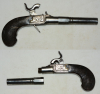 Französische Kastenschlosspistole mit Klappabzug, etwas massiver als ein normales Terzerol, um 1820, von Steinschloss aptiert, abschraubbarer Lauf, Kasten beidseitig mit Militärmotiven graviert, Lauflänge 13cm, Gesamtlänge 24,4 cm, Kaliber 12,5 mm, guter mängelfreier Zustand
