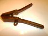 Kugelgießzange / Kugelzange / Gießkokille Cal. 36. Hersteller Kennzeichnung ein U in Schreibschrift in einem doppelten 8-Eck mit Dreieck oben und dem Vermerk Italy. Wahrscheinlich aus Messing (nicht magnetisch), zumindest messingfarben. Kleine Ausführung 12,5 cm